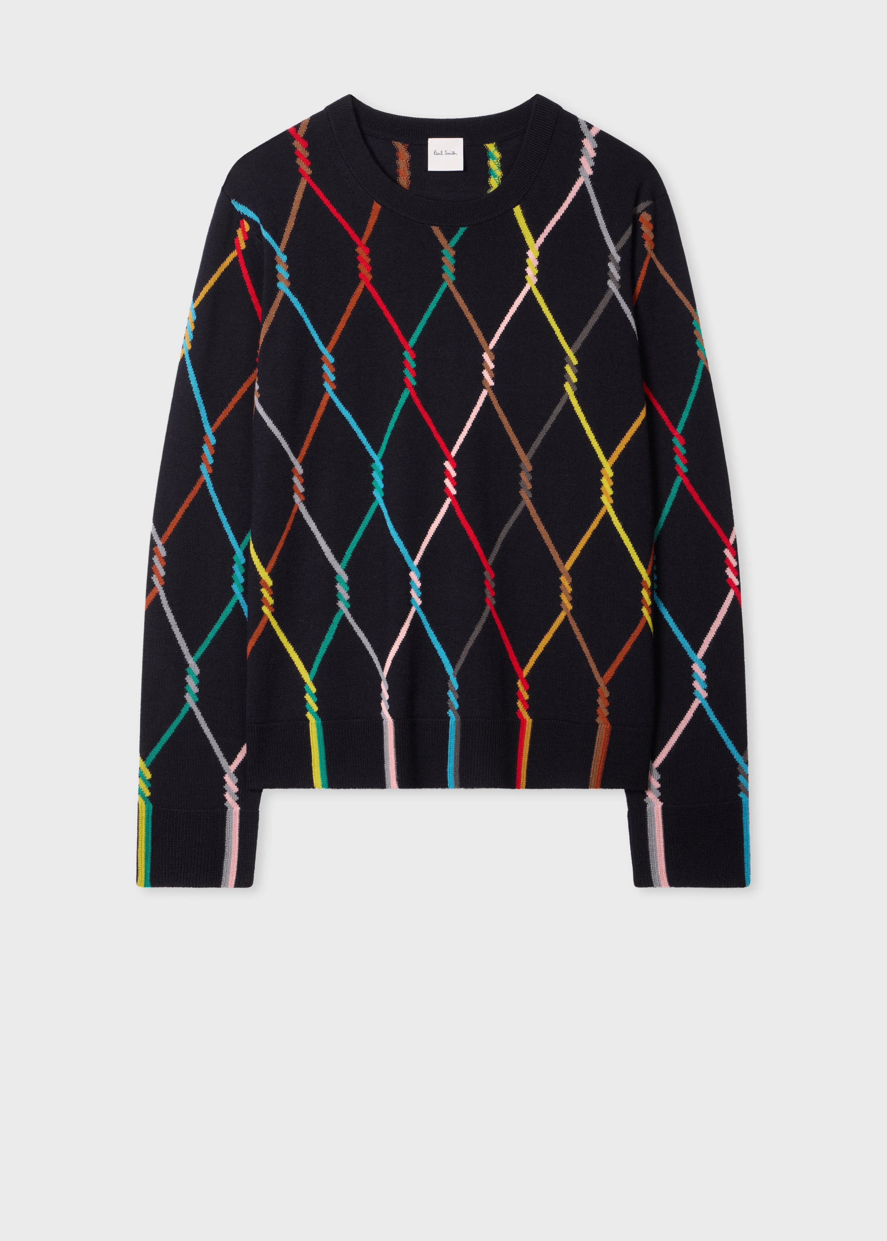 Crafted from soft wool, this navy crew-neck sweater showcases an intarsia diamond pattern in our classic 'Signature Stripe' colourway. Cut to a regular fit with ribbed trims, it's a versatile layer for the transitional season. The Fit - Regular-Fit is relaxed through the body. Product Code: W1R-672N-V11214-49