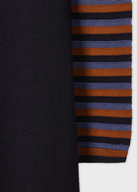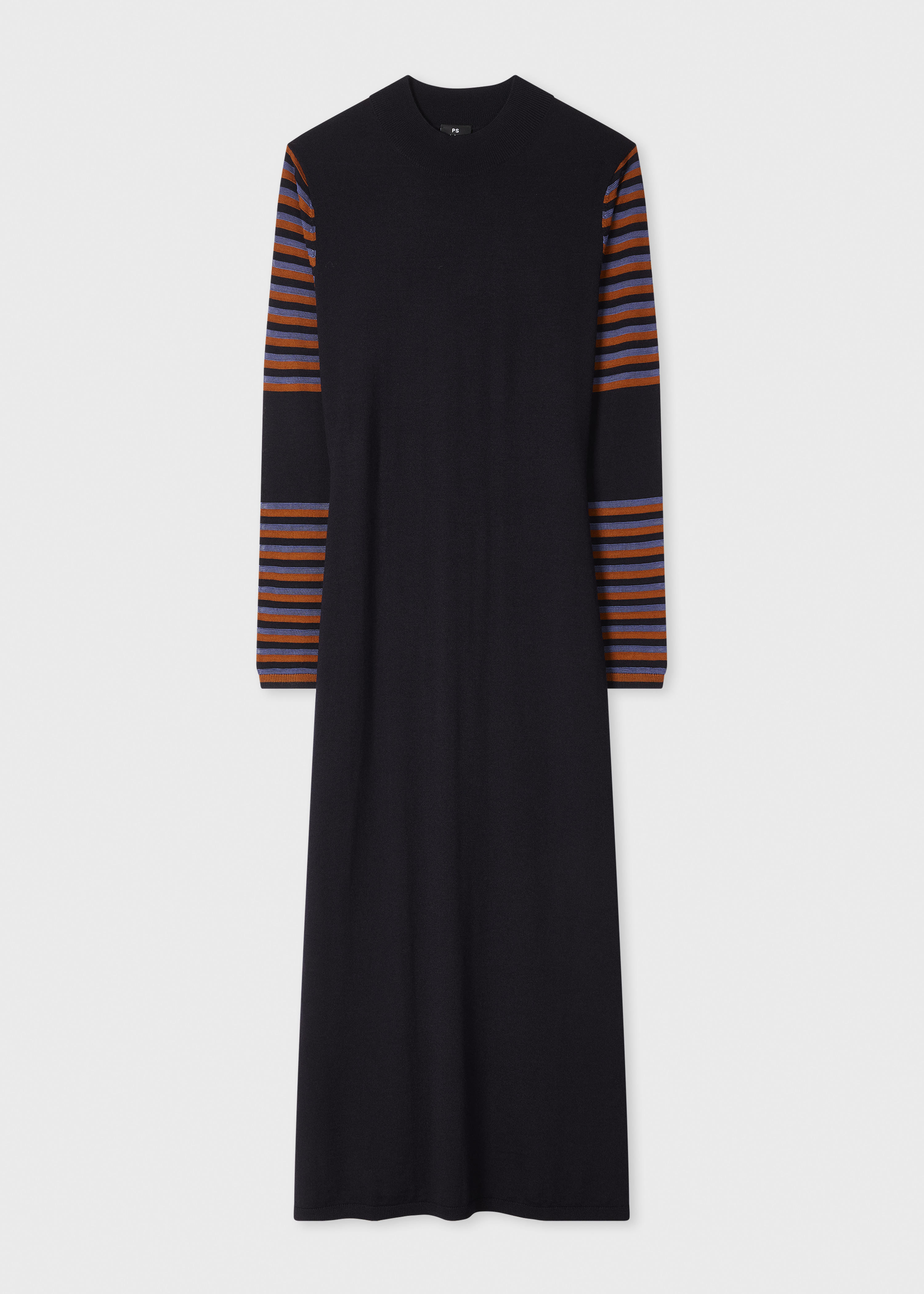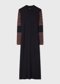 Crafted from a merino wool blend, this navy knitted midi dress features contrasting striped sleeves for a unique touch. In a lightweight knit, the dress features ribbed trims. Ideal for the transitional season, pair with ankle boots for elevated everyday styling. The Fit - Regular-fit Product Code: W2R-659N-T31383-49