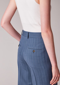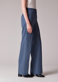 Crafted in Italy from a viscose-wool blend, these slate blue trousers feature a subtle pinstripe design throughout. Expertly finished with feminine pleat detailing to the centre, button-fastening rear jetted pockets, and side seam pockets to the front. Ideal as a standalone or paired with matching pieces, these trousers are a seasonal staple. The Size Model wears a size 40 (UK 8) Model measures: Height 5’11’’ / 180cm | Chest 30½’’ / 78cm | Waist 24’’ / 61cm The Fit - Wide-Leg Product Code: W1R-332T-T10827-44