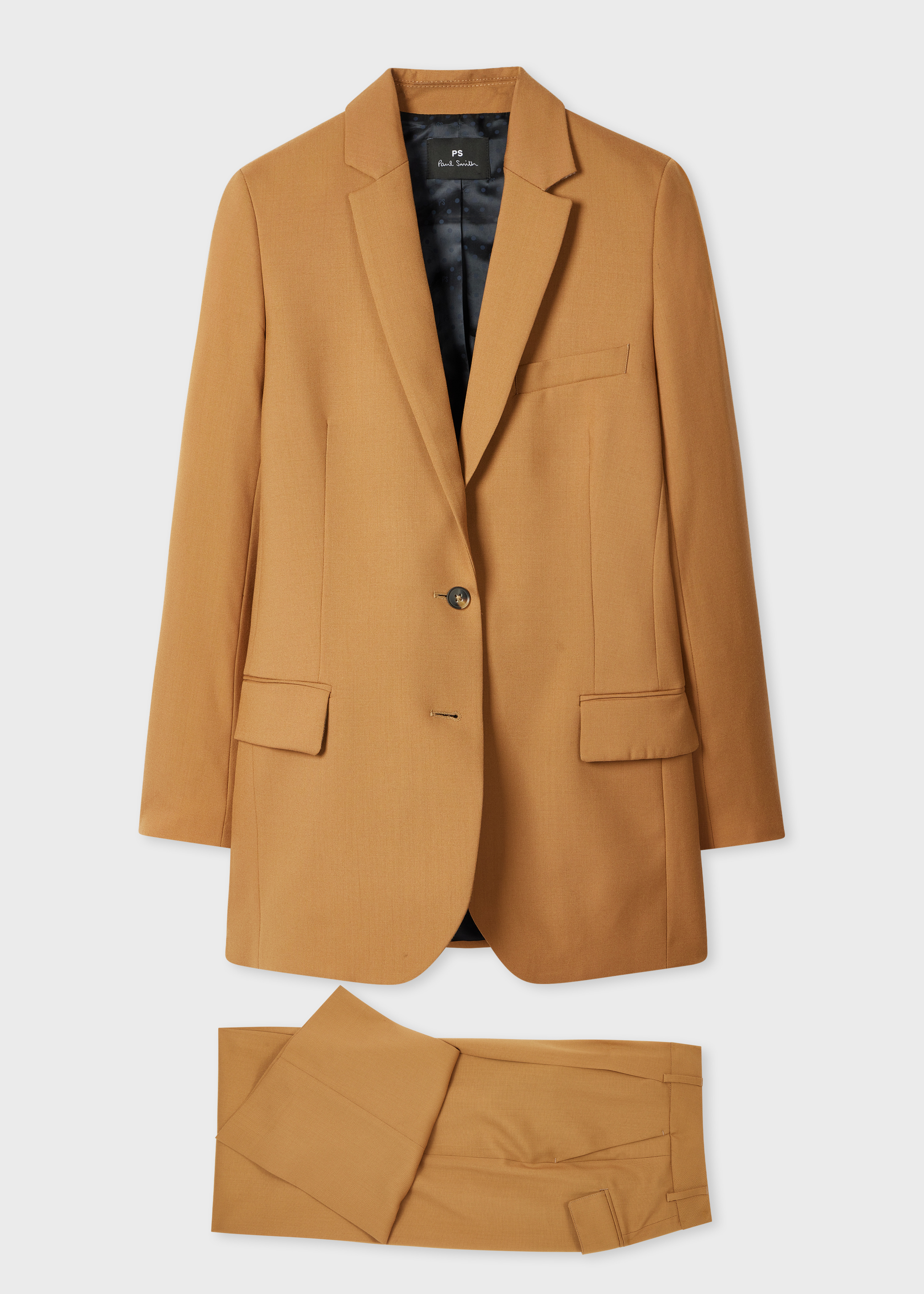 Crafted in Portugal from premium wool hopsack fabric, this tan suit offers a sophisticated silhouette with a classic fit. The longline blazer is designed with clean lines and tailored details. The wide-leg trousers feature a pleated front, internal lined detailing, faux flap back pockets, and front angled side pockets. Product Code: W2R-SUIT-T31053-68