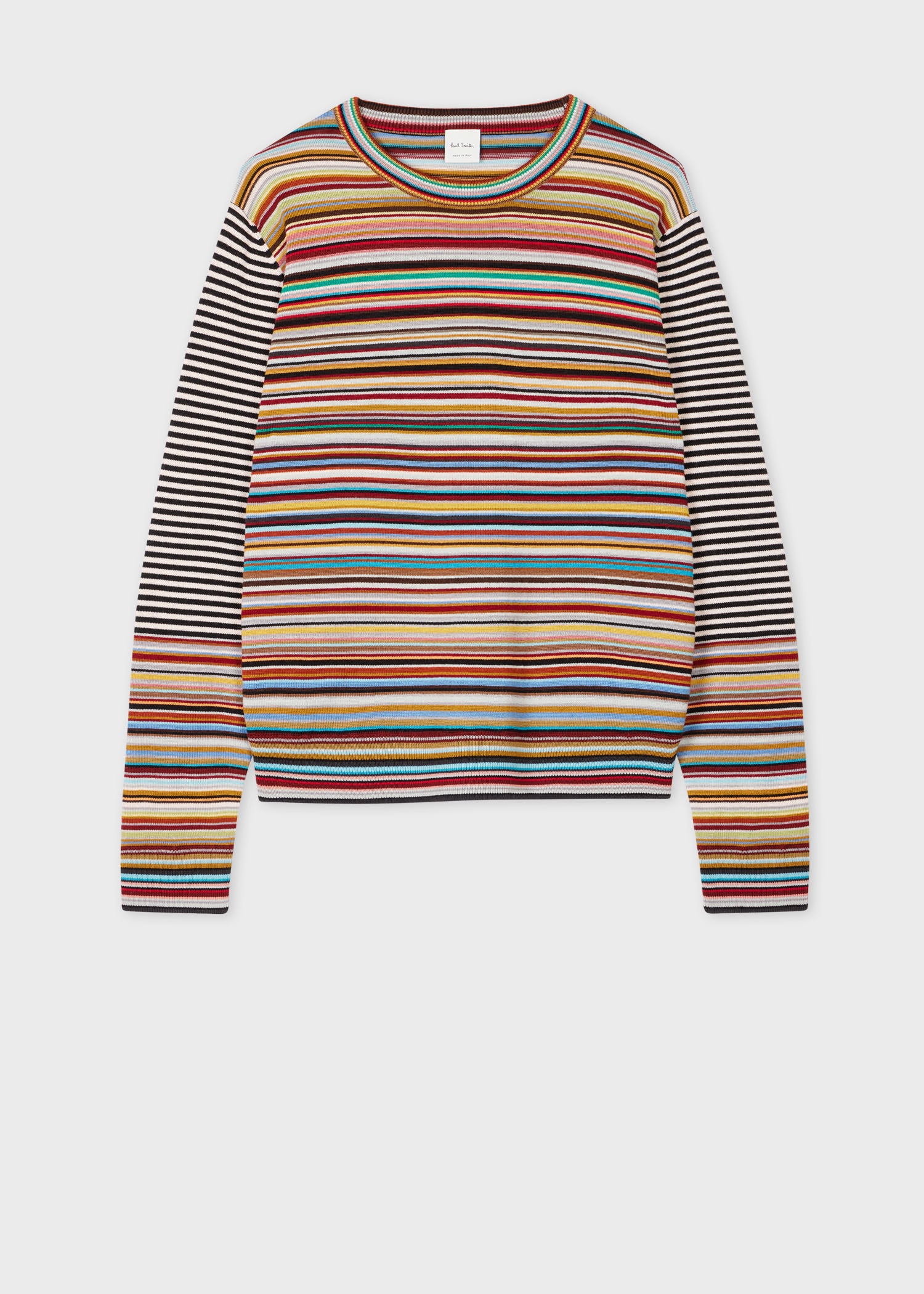 Made in Italy from virgin wool this 'Signature Stripe' sweater features contrast striped sleeves for a distinctive touch. In a lightweight knit, this sweater features ribbed trims and a crew neckline. Pair with soft tailored pieces for signature seasonal styling. 100% Virgin Wool Hand wash or dry clean only Made in Italy The Fit Regular-Fit is relaxed through the body. Product Code: W1R-529N-P11122-92