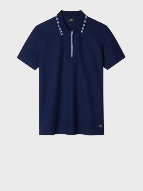 Navy Wool-Cotton Zip Neck Knitted Polo Shirt