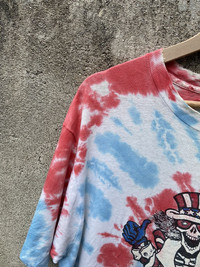 Vintage 1988 The Grateful Dead GD Movie Mascot Uncle Sam Skeleton Tag : fruit Size : L Armpit to armpit : 21.5 inches Shoulder to Length : 29.5 inches Condition : distressed back Tshirt overall good condition *Please compare the measurement with your garment before purchase this item PAYMENT : PAYPAL ONLY SHIPPING : DHL EXPRESS SHIPPING (estimated 1-6 days delivery time depend on location & custom clearance) PLEASE LEAVE THE CONTACT NUMBER as the shipping company always need the phone number for delivery process NO REFUND NO RETURN Please bear in mind that this item had been used previously. Sign of wear and ages might be available on it. All item will be described as is Please check all pictures and ask question for any additional info before purchase. Some items are USED, VINTAGE & PRE LOVED items, so dont expect it to be like NEW condition. Dont hesitate to
