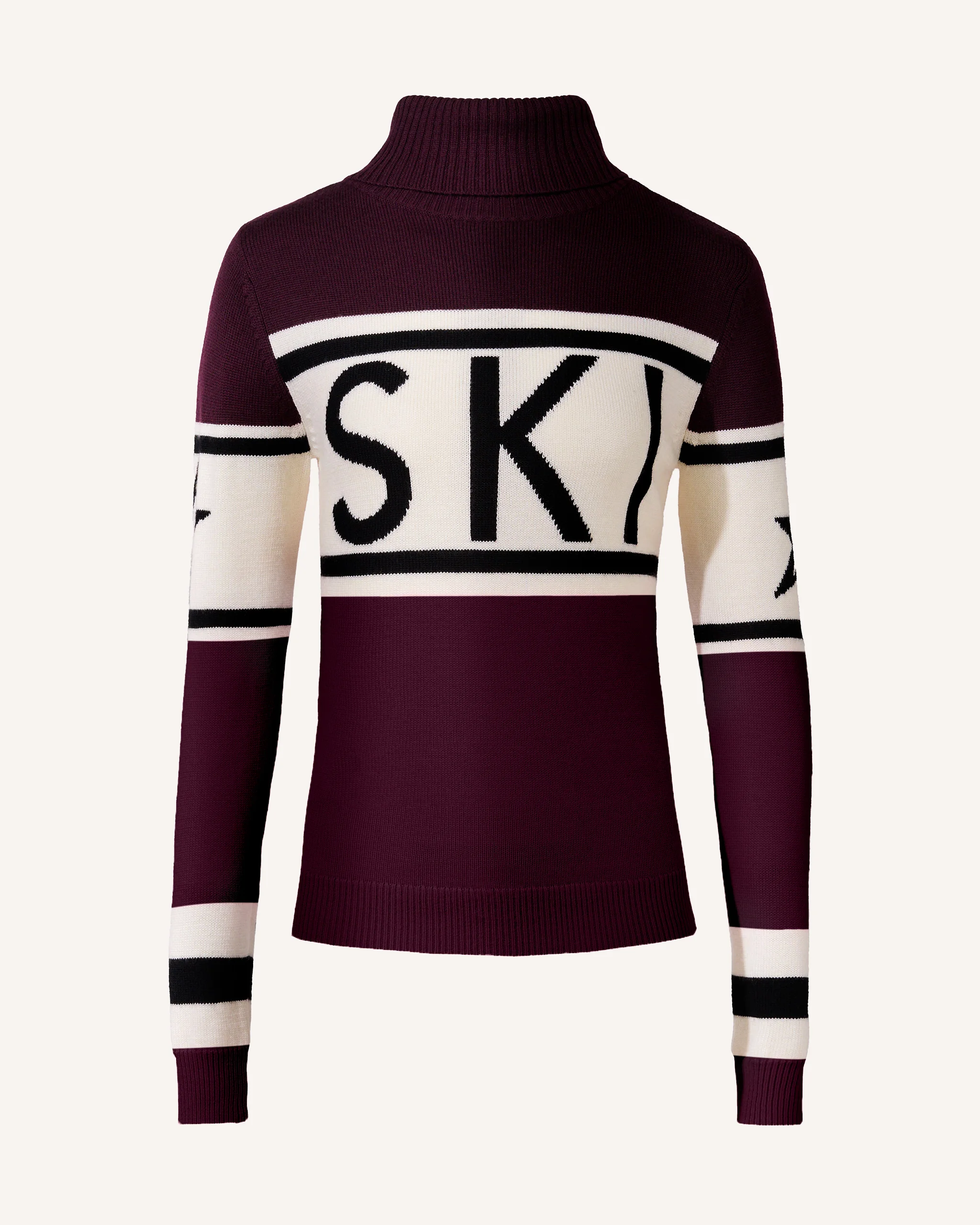 A Perfect Moment icon, the Schild Sweater is our bestselling knit—crafted from soft, temperature-regulating Merino wool for reliable warmth on and off the slopes. With its fitted silhouette and bold “SKI” intarsia across the chest, it delivers signature style in a timeless winter staple. Breathable and versatile, it layers effortlessly under outerwear or stands alone for apres. Pair with any of our Aurora ski pants for a considered, cold-weather look. Fitted Intended to hit at the hip Turtleneck Long sleeves Rib knit hem and cuffs "Ski" intarsia-knit at the center front This knitwear is delicate. Please treat with caution as abrasion can damage the fabric. May pill slightly, this is natural with fine knit fabric Imported Product Code: W30013272189 Materials & Care Materials - 100% Merino Wool Care - Hand wash cold separately - Do not bleach - Lay flat to dry - Cool iron if needed or dry clean