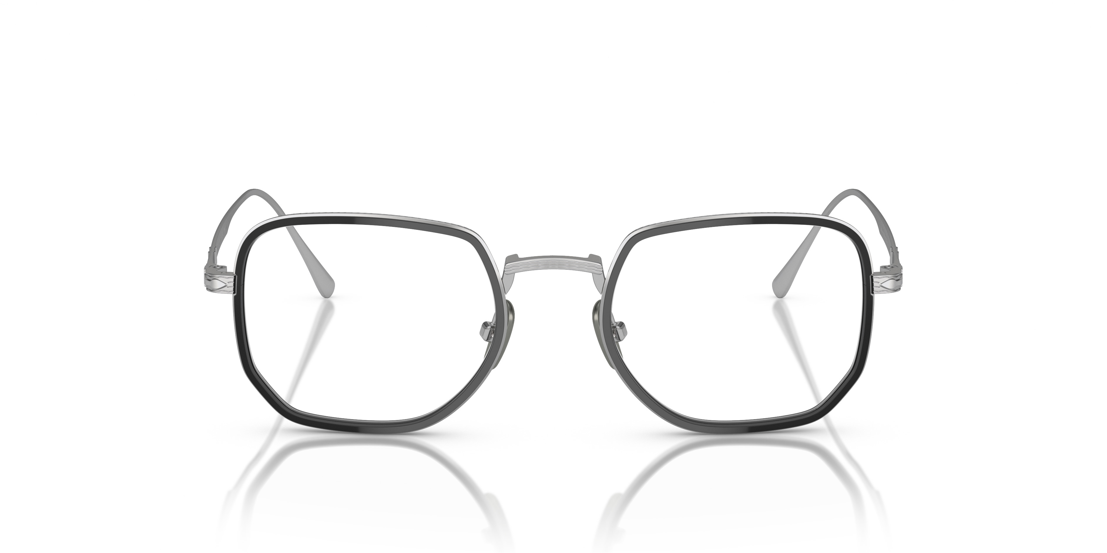 The Titanium collection, where Italian artisans and Japanese masters unite to create this rectangular shape with branded titanium nosepads that redefine Persol's legendary craftsmanship. MODEL CODE: PO5006VT 8006 47-20 FRONT COLOR: Silver/Black LENS COLOR: Clear LENS MATERIAL: Plastic FRAME MATERIAL: Titanium FIT: Narrow Fitting BRIDGE CHOICE & NOSEPAD: Adjustable Nosepads MADE IN: Japan