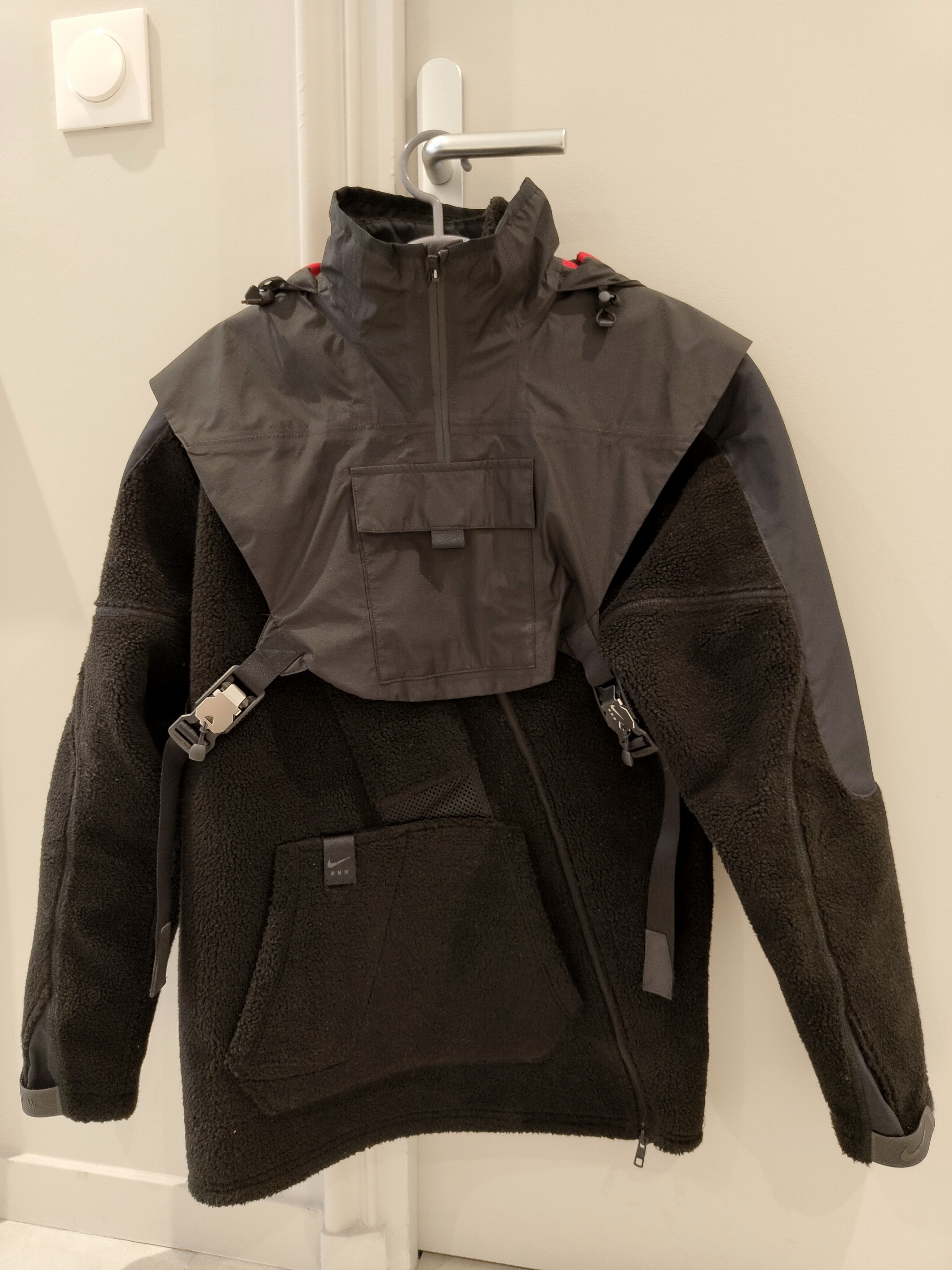 Very warm, wind and water resistant polar fleece jacket. Removable waterproof hood with Fidlock magnets. Made in collaboration of Matthew M Williams with Nike. A mix of technical clothing/techwear, athleisure and streetwear aesthetics. Worn only a few times, as good as new. It is too long for me and doesn't really suit my body type (I'm 165cm and 60kg). Size and fit: XS but fits long and quite roomy (would be ideal for a ~170-175cm person with a lean to mild overweight or athletic build) Temperature to be worn: under 15°C (with just a t-shirt underneath) to 0°C (with a thermal shirt and/or sweater) Features: Removable waterproof hood with Fidlock magnetic straps and a chest velcro pocket. Open pouch pocket, phone pocket with velcro strap, utility chest pocket with drawstring. Assymetrical zip closure. Velcro adjustable sleeves hems. Release season: Fall/Winter 2019 ( FW19 ) Release price: 529€ Model: CK1541-010 #techwear #matthiewmwilliams #nike #streetwear #athleisure