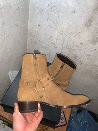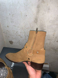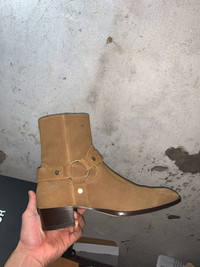 SAINT LAURENT TOBACCO SUEDE HARNESS BOOTS IN SIZE 42
