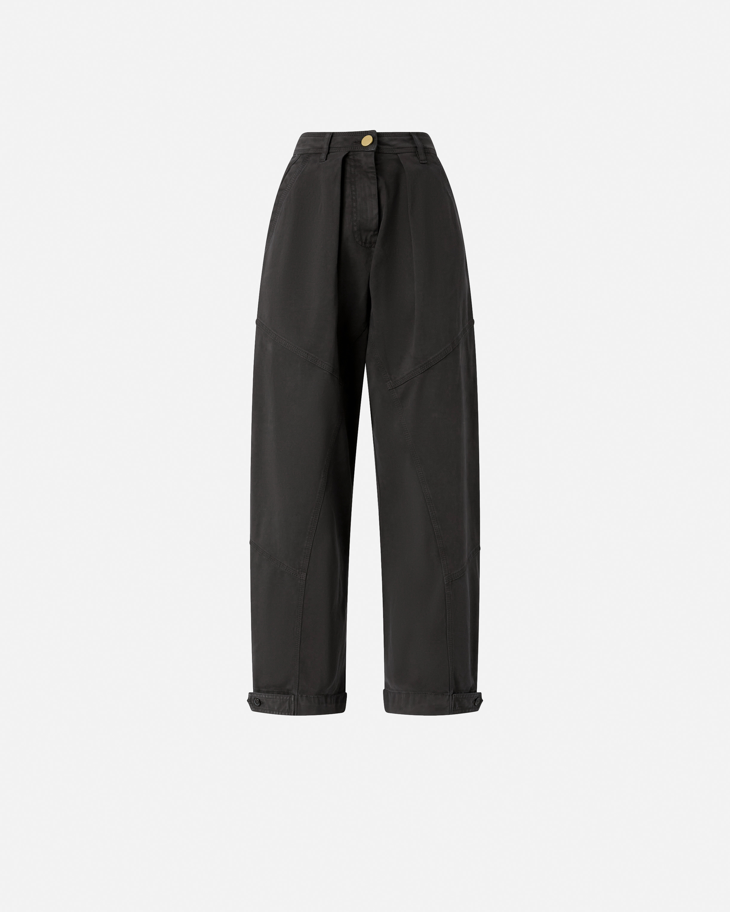 PANCARRE' TROUSERS − 105667A2TVM04 Balloon-fit trousers with a loose, rounded leg at the top and more cinched on the hem, where there is also a strap to adjust the fit according to your needs. This style, made from garment-dyed slightly elasticated cotton with a brushed effect, features belt loops, side pockets, welt pocket on the back and crossed back loops. Concealed zip and button fastening. COMPOSITION Outside Fabric: COTTON 97% ELASTANE 3% - Lining: COTTON 100%