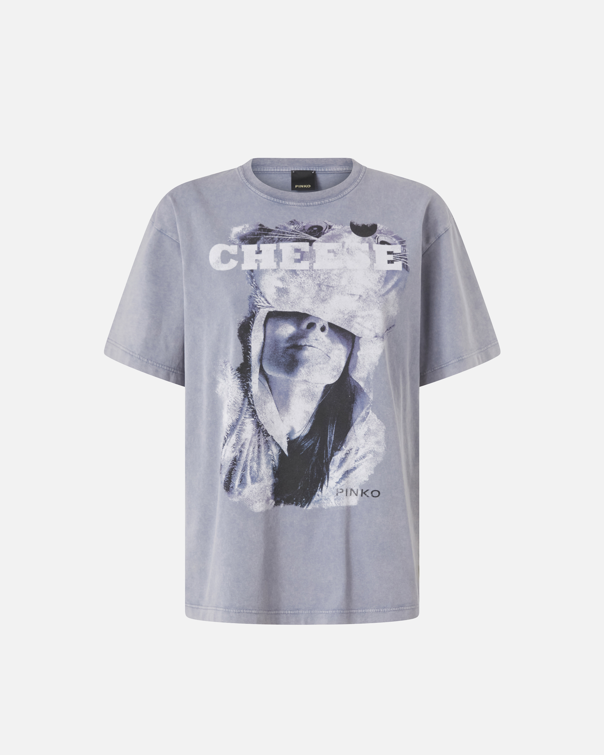 STRABILIANTE T-SHIRT − 105789A2VII41 Short-sleeved crew-neck T-shirt in pure cotton jersey with a special marble-effect dye. The piece stands out with its fun front print with a feminine face accompanied by CHEESE lettering and the signature PINKO lettering logo. This T-shirt will work seamlessly with your favourite trousers, elevating your look in a simple, elegant and original way. COMPOSITION 1° Outside Fabric: COTTON 100% - 2° Outside Fabric: COTTON 100%