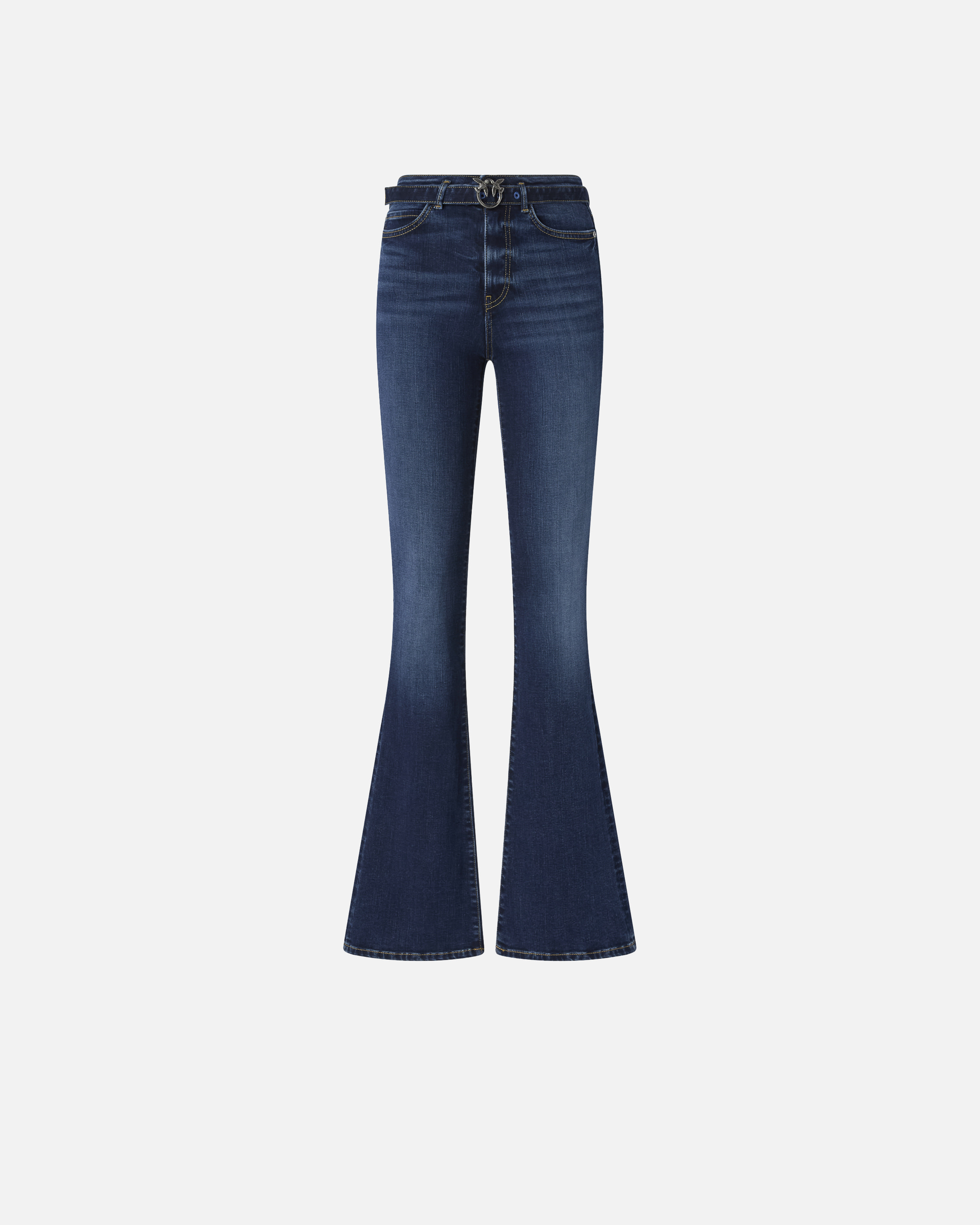 FLORA FLARE − 100166A2RXPJB Flared five-pocket jeans with a fitted leg to the knee that flares on the hem, made from cotton-blend power stretch denim with a soft hand. The fabric used is a high recovery denim that does not lose its shape easily and thus will retain its original shape over time. The brand's lettering logo embroidered on the back of the waistband and the Love Birds logo with embroidered birds on the right back pocket add pure PINKO style to the design. Complete with a matching-fabric belt with the metal Love Birds Diamond Cut buckle. Mid-rise with belt loops and a zip and button fastening. COMPOSITION Outside Fabric: COTTON 71% POLYESTER 18% VISCOSE 9% ELASTANE 2% - Lining: POLYESTER 65% COTTON 35%