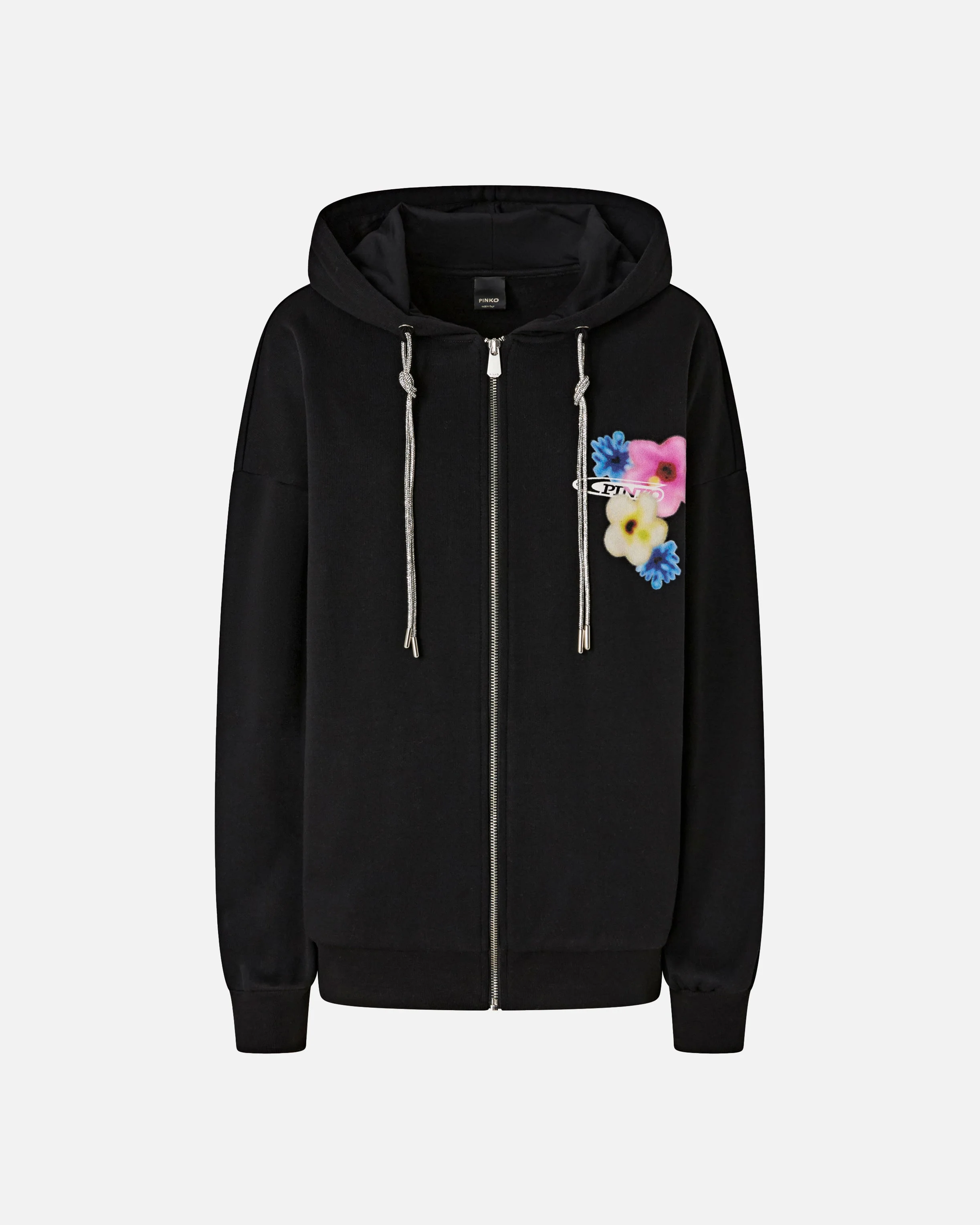 105701A2R2-Z99 Long-sleeved brushed cotton hoodie with a front zip fastening. This style features a multi-coloured floral print, made with a digital technique, found in a maxi-version on the back and in a mini-version on the left side of the chest, accompanied by the PINKO lettering logo as always. The hood is adjustable by means of a sparkling rhinestone-covered drawstring, perfect for giving the garment a feminine touch. This sweatshirt is ideal for casual early-season looks, delivering original style for all-day wear. COMPOSITION 1° Outside Fabric: COTTON 100% - 2° Outside Fabric: COTTON 96% ELASTANE 4% - Lining: COTTON 100% - Accessory 1: Glass 100% - Accessory 2: COTTON 100% MEASURES W: 0.88 g