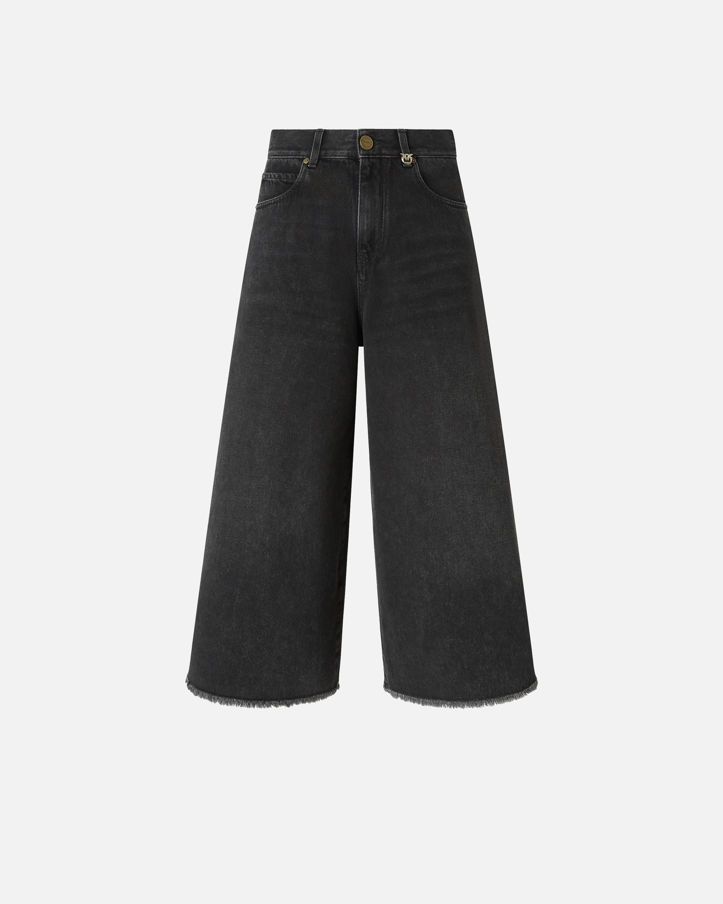 BURKINA BERMUDA − 104646A2SAPJ4 Long, wide-leg, 70s-inspired, five-pocket shorts and a wide leg with a frayed hem, made from black cotton denim with a fluid hand, a stonewash and sanding for a distressed finish. The detachable belt loop with Love Birds logo adds pure PINKO style to the design. Wear these denim shorts with a pair of high boots for a striking look even in winter. Mid-rise with belt loops and a zip and button fastening. COMPOSITION Outside Fabric: COTTON 100% - Lining: POLYESTER 65% COTTON 35%