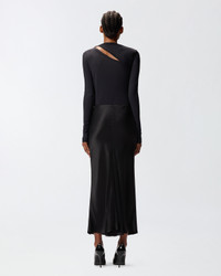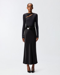 DIGNA SKIRT − 106075A1Y5Z99 Long satin skirt with a fluid and slightly flared silhouette, with a high waist and a soft fall to the ankle. The smooth and shiny surface of the fabric gives the garment an essential and sophisticated elegance, perfect for enhancing every movement. Wear it with a fitted top and minimal sandals for a refined and timeless look. COMPOSITION Outside Fabric: ACETATE 91% POLYESTER 9%