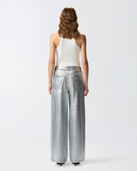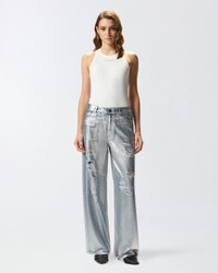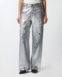 LAURYN LOOSE − 104601A2RTGU9 Loose-fit five-pocket jeans with a dropped crotch and low-rise waist made from slouchy lyocell and cotton denim for greater fluidity. This piece has localised rips and mends and a contrasting interior, but it stands out above all for its shiny and attractive metallic effect, given by a silver-tone laminated print that is applied to the finished garment to give it a three-dimensional look. The lettering logo embroidered on the back of the waistband and the detachable belt loop with Love Birds logo add pure PINKO style to the design. Belt loops and front concealed zip and button fastening. This model is a little wider than the usual size. COMPOSITION Outside Fabric: COTTON 77% LYOCELL 23% - Lining: POLYESTER 65% COTTON 35%