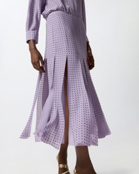 106260A32X-Q50 Midi skirt featuring unique panels at the hem that form wide fringes and create the illusion of a pleated design. Made from georgette fabric with a refined matte finish, which delicately caresses the body and delivers a light, fluid silhouette, this model is embellished with shiny rhinestones dotted all over in a way that encapsulates PINKO's DNA as a brand. The skirt, which is lined, is finished with a side fastening with invisible zip, providing a discreet functional touch without interrupting the continuity of the design. - RUCOLA SKIRT COMPOSITION Outside Fabric: POLYESTER 100% - Lining: POLYESTER 100% - : Glass 100% MEASURES W: 0.52 g