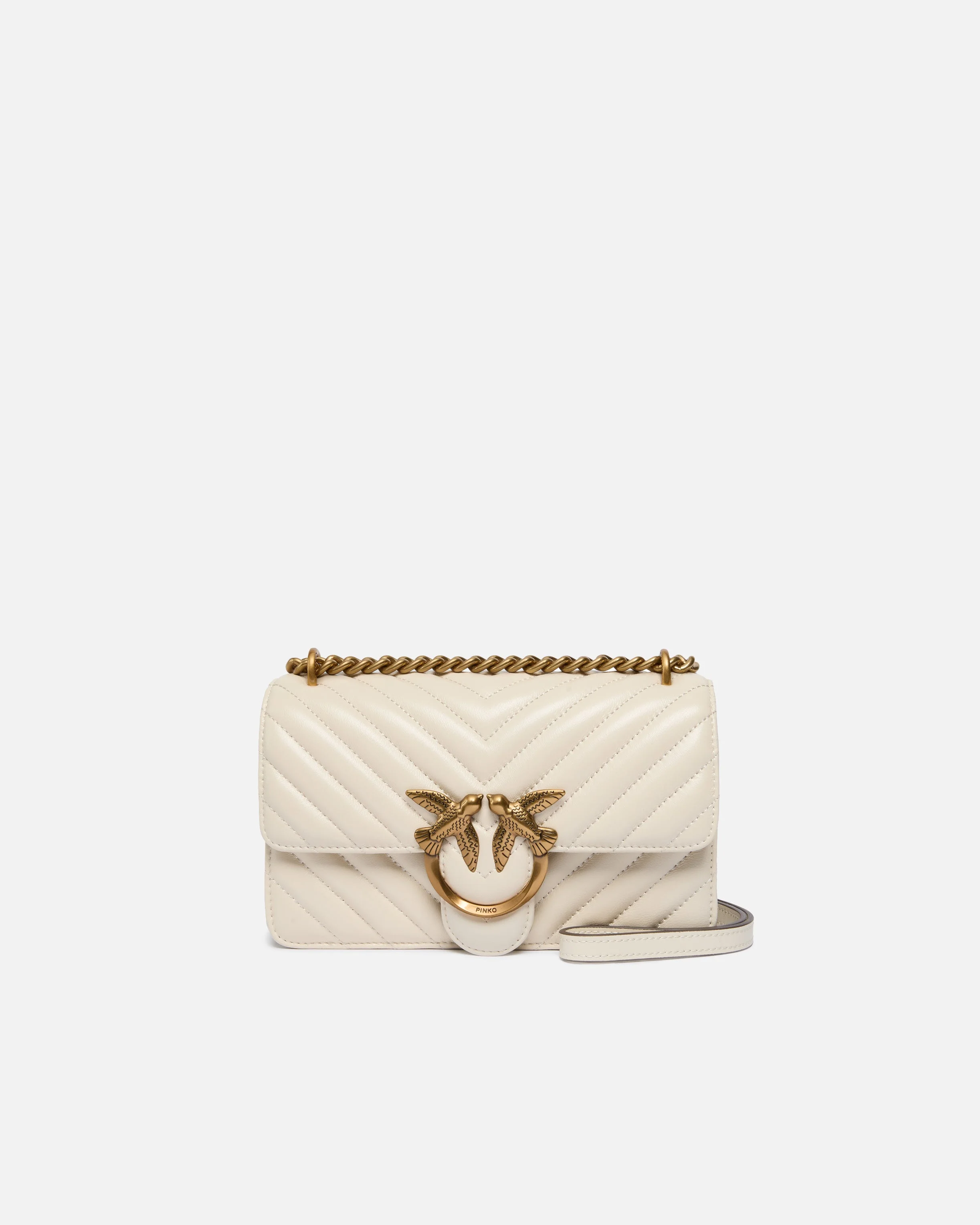 Mini Love Bag One in quilted nappa leather with chevron pattern. The fastening is embellished with the iconic metal Love Birds Diamond Cut buckle. The accessory boasts a microsuede-lined interior, complete with zipped centre divider pocket and leather slip pocket. The shoulder strap combines the classic round-link chain with a practical, adjustable leather shoulder pad. Activate your PINKO bag: verify the authenticity of your product and access a personalised experience by scanning the Love Birds embroidery on the back of the bag with your smartphone! COMPOSITION Lining: POLYAMMIDE 50% POLYAMIDE 50% POLYURETHANE 50% - Leather: SHEEP LEATHER 100% SHEEPSKIN LEATHER 100% - Material: COWHIDE 92% BOVINE SKIN 92% POLYURETHANE 8% - Material 1: POLYAMMIDE 50% POLYAMIDE 50% POLYURETHANE 50% MEASUREMENTS - Height: 12 cm - Width: 7 cm - Length: 21 cm