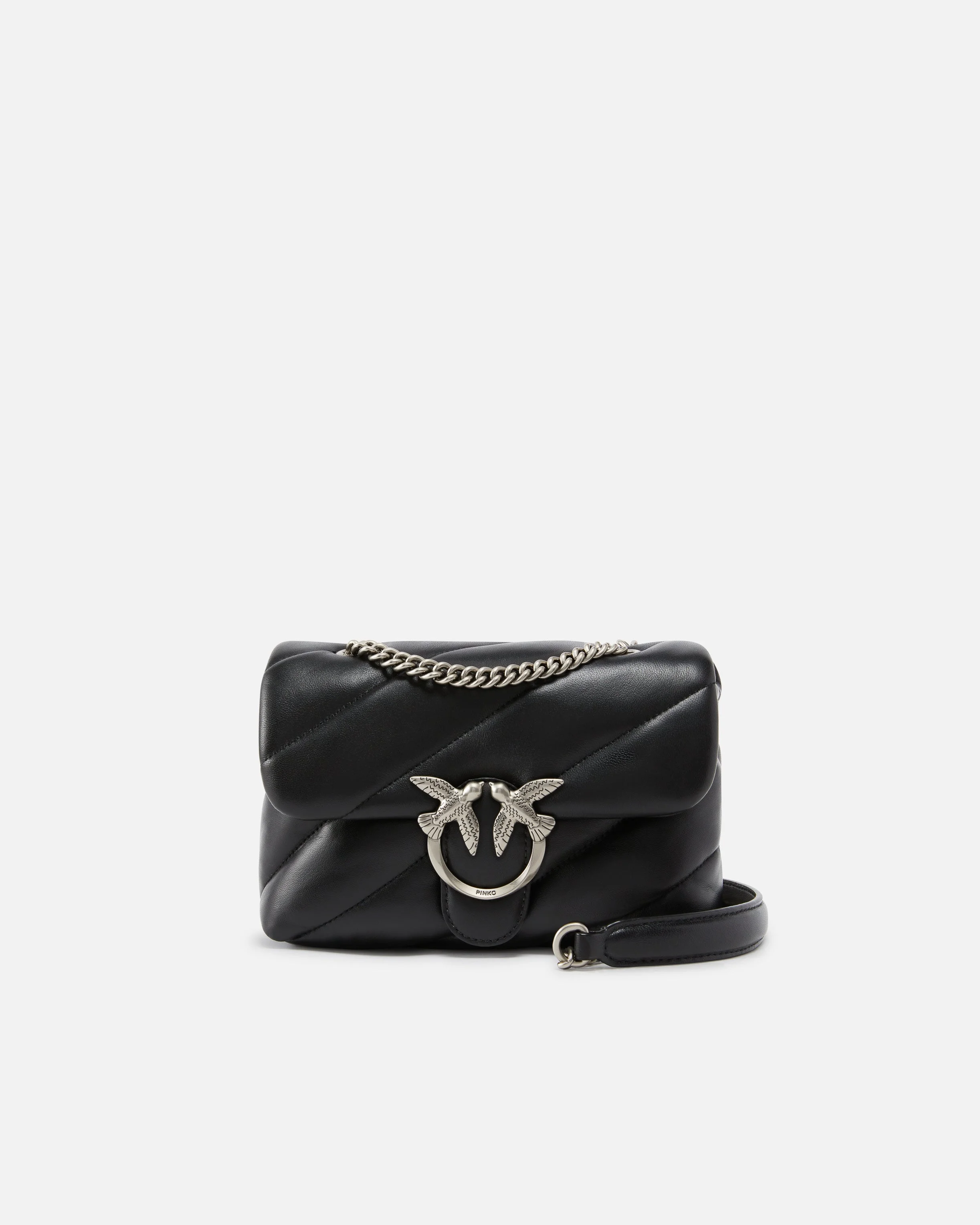 Mini Love Bag Puff in soft nappa leather featuring large slanted quilting. The fastening is complete with the iconic metal Love Birds Diamond Cut buckle. The accessory boasts a microsuede-lined interior, complete with a zipped centre divider pocket and slip pocket. The shoulder strap combines the classic round metal chain with a practical nappa leather shoulder pad. Activate your PINKO bag: verify the authenticity of your product and access a personalised experience by scanning the Love Birds embroidery on the back of the bag with your smartphone! COMPOSITION Lining: POLYAMMIDE 50% POLYAMIDE 50% POLYURETHANE 50% - Leather: SHEEP LEATHER 100% SHEEPSKIN LEATHER 100% - Accessory: Zinc 100% MEASUREMENTS - Height: 15 cm - Width: 10 cm - Length: 22 cm