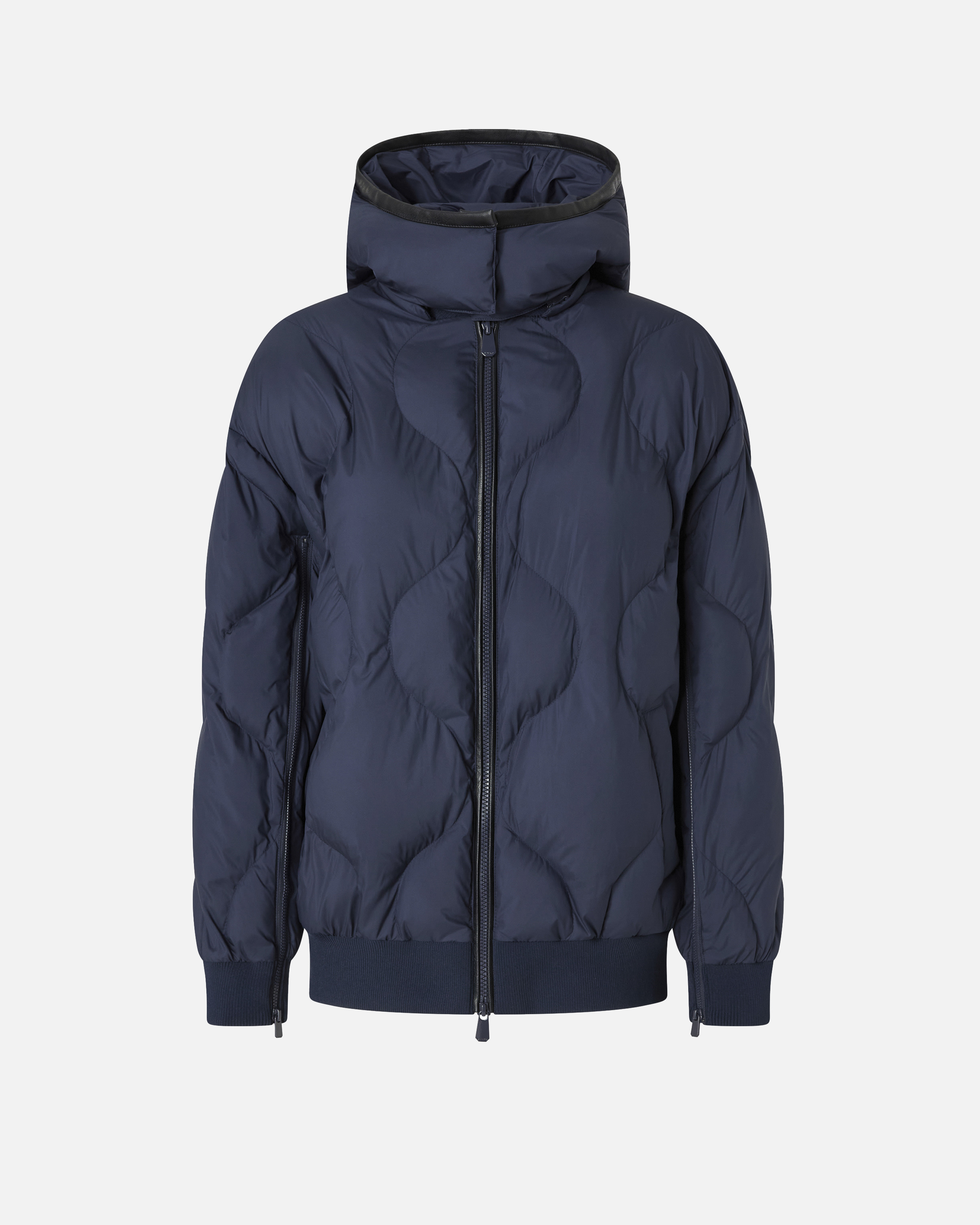 CAVIALE BOMBER − 105336A2OKG82 Padded bomber jacket with onion quilting made from comfortable and durable technical canvas and finished with a rib-knit collar, cuffs and hem. The design features a detachable zip-off hood and long sleeves that can be opened by zip to turn the garment into a cape. It is completed by coated-effect finishes on the edge of the hood and along the front fastening with two-way zip. The perfect piece to face the first cold spells with a touch of style that has not sacrificed comfort. COMPOSITION 1° Outside Fabric: POLYESTER 100% - 2° Outside Fabric: VISCOSE 100% - Accessory Yarn: POLYESTER 98% ELASTANE 2% - coating: POLYURETHANE 100% - Body lining: POLYAMMIDE 100% POLYAMIDE 100% - Sleeve lining: POLYESTER 100% - Padding: POLYESTER 100%