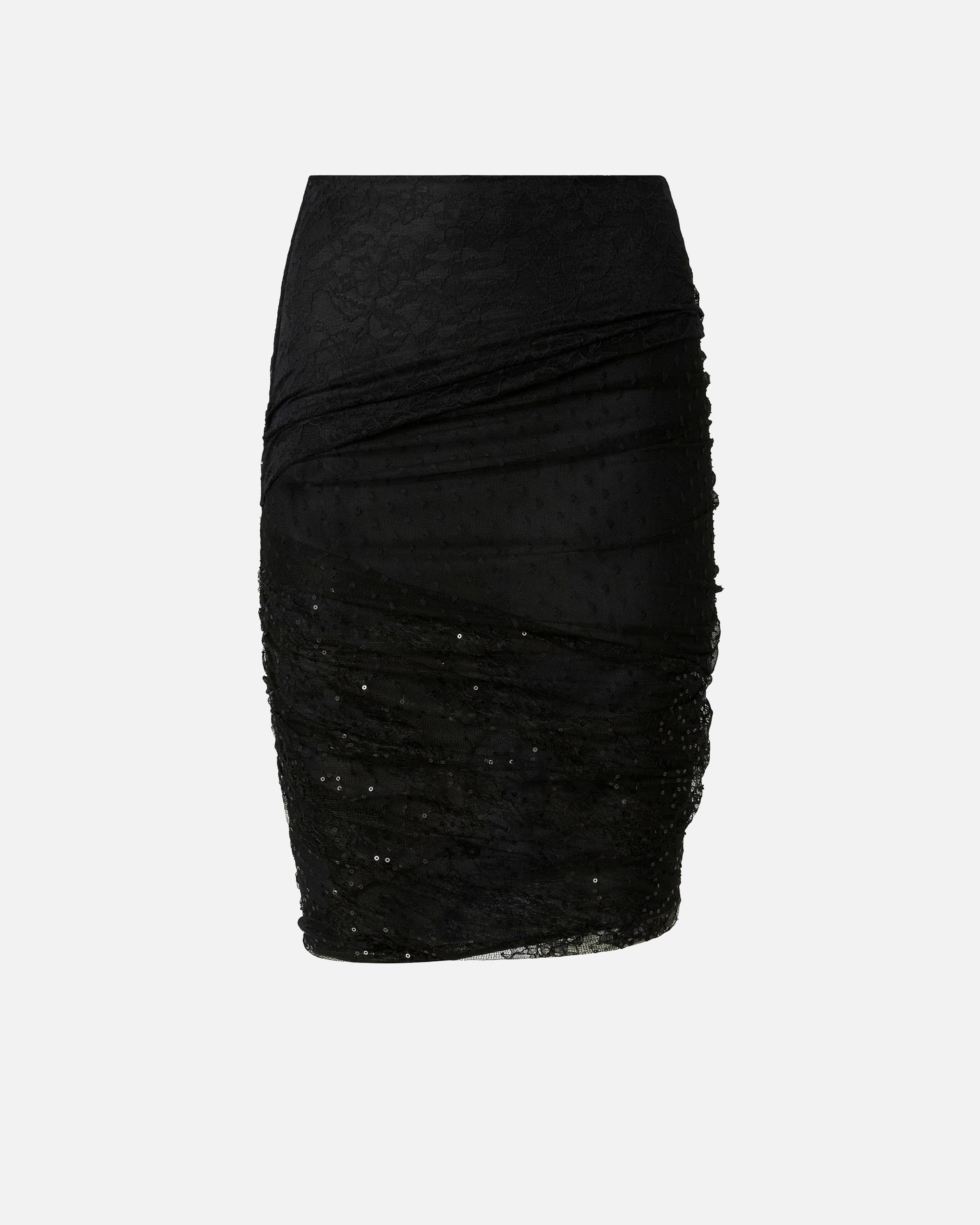 BIRILLI SKIRT − 105584A2T5Z99 Lace pencil skirt with a distinctive patchwork-effect design combining different patterns. The design is made with three distinct lace motifs, each chosen to create visual contrast, and is especially illuminated by the sequinned embroidery. The fabric greatly improves the fit of the garment, while ensuring comfort and a perfect fit to the figure. In addition, the strategic draped detailing that wraps the silhouette creates sensual sheerness and emphasises curves with a dynamic and fluid effect. COMPOSITION 1° Outside Fabric: POLYAMMIDE 100% POLYAMIDE 100% - 2° Outside Fabric: POLYAMMIDE 89% POLYAMIDE 89% ELASTANE 11% - 3° Outside Fabric: POLYAMMIDE 100% POLYAMIDE 100% - Lining: POLYAMIDE 90% POLYAMMIDE 90% ELASTANE 10%