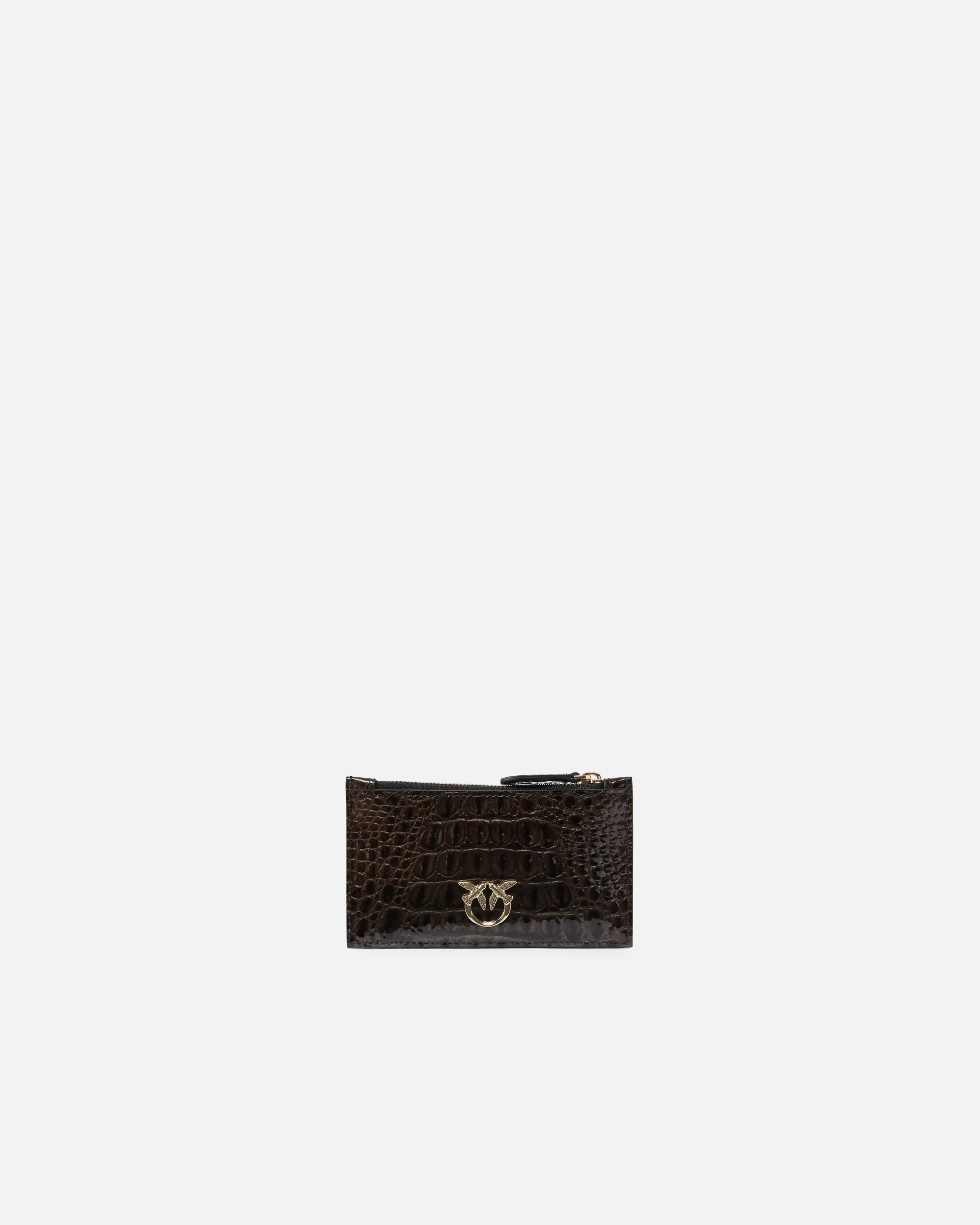 Card holder in shiny crocodile-print leather with a strikingly intense colour. Customised with metal Love Birds Diamond Cut logo plaque. Contrasting-colour polycotton inner lining. Zip fastening. The accessory is part of the Limited Edition special capsule collection which comprises PINKO Galleria-exclusive limited-edition models. COMPOSITION Lining: VISCOSE 100% - Leather: CALF LEATHER 100% CALFSKIN LEATHER 100% - Leather: CALF LEATHER 100% CALFSKIN LEATHER 100% MEASUREMENTS - Height: 8 cm - Width: 0.5 cm - Length: 13.5 cm