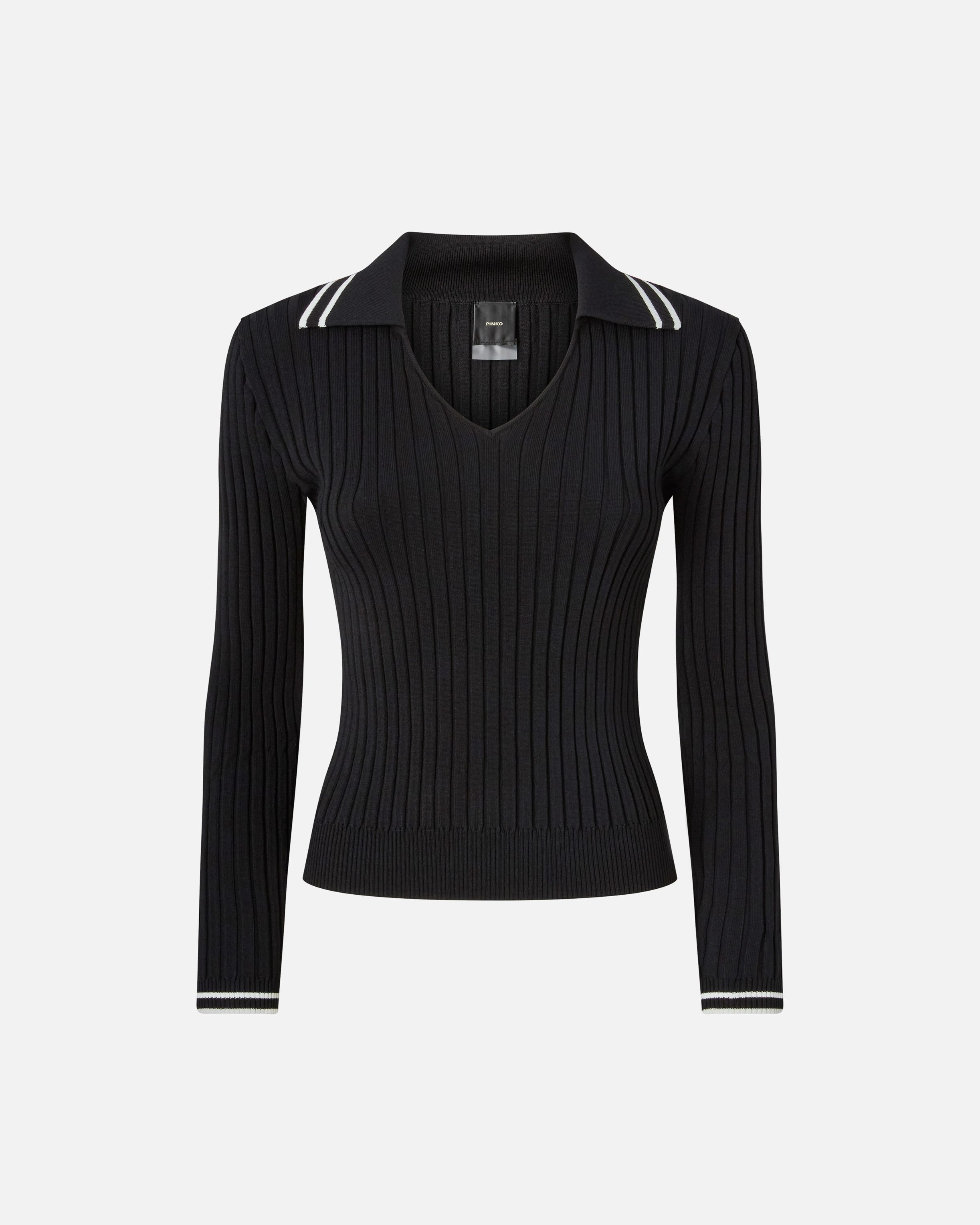 LINOSA POLO − 105418A2PSZ99 Lightweight, stretchy rib-knit viscose sweater. The polo-style collar and double contrasting stripes make the piece suitable for completing endless preppy looks. The piece has undergone finishing tests to minimise the possible formation of pilling, ensuring greater fabric softness and durability. The style is completed by a tone-on-tone label with the PINKO lettering logo on the left side of the chest. COMPOSITION Outer Yarn: POLYAMIDE 51% POLYAMMIDE 51% VISCOSE 49%