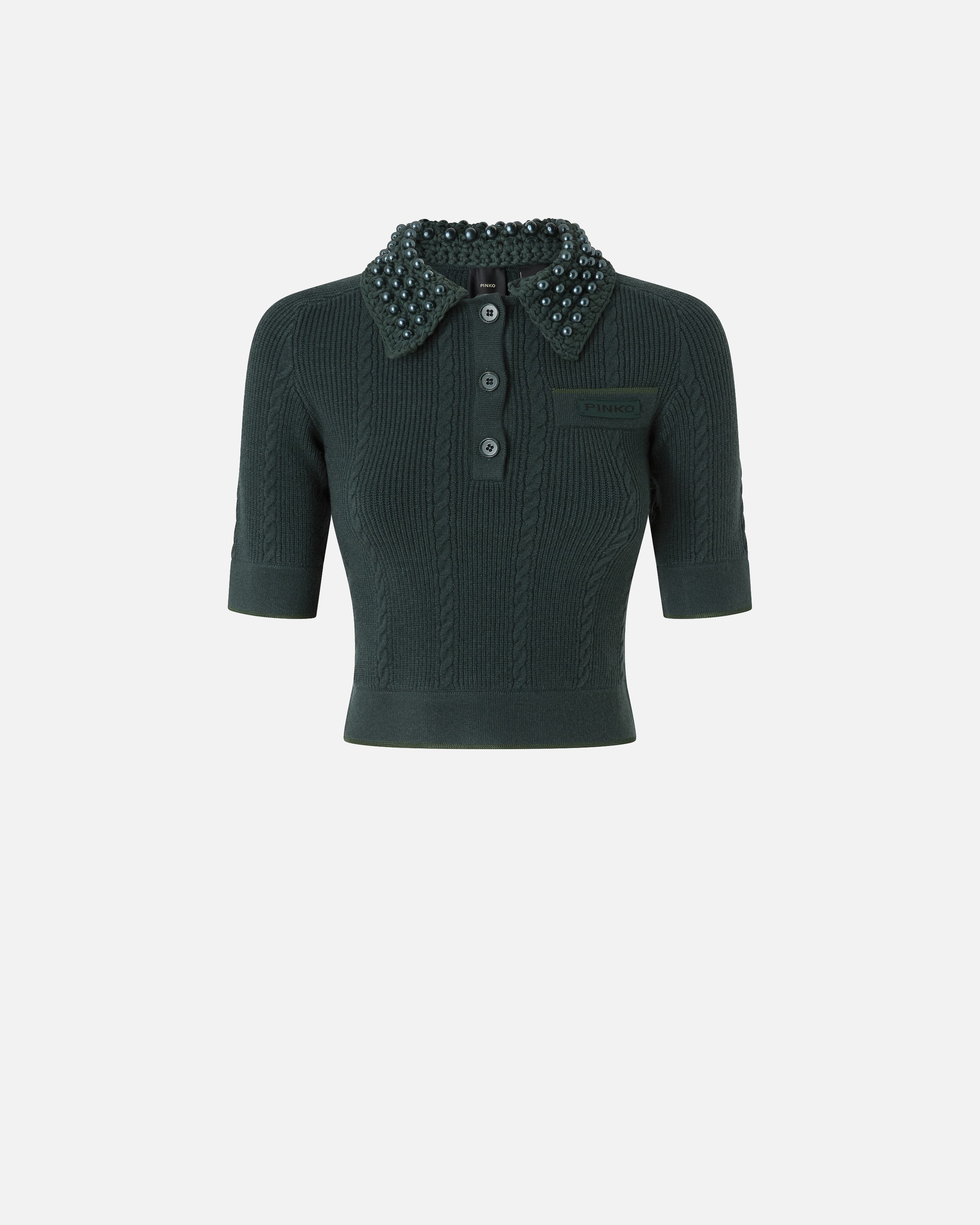 EOLIE POLO − 105484A2QZX34 Short slim-fit polo-style sweater in a viscose-blend knit fabric. The design is animated by the alternating cable knit and rib knit, as well as being embellished by the pearl detailing in the same colour on the collar. The sleeve trims and hem are elasticated, while the tone-on-tone label with the PINKO lettering logo stands out on the front. The piece has undergone finishing tests to minimise the possible formation of pilling, ensuring greater fabric softness and durability. Practical, original and with unique style: this style is destined to become a real go-to piece. COMPOSITION Outer Yarn: ACRYLIC 62% POLYESTER 28% WOOL 10% - Neck: COTTON 100% - : ACRYLIC RESIN 100% ACRYL.RES. 100%