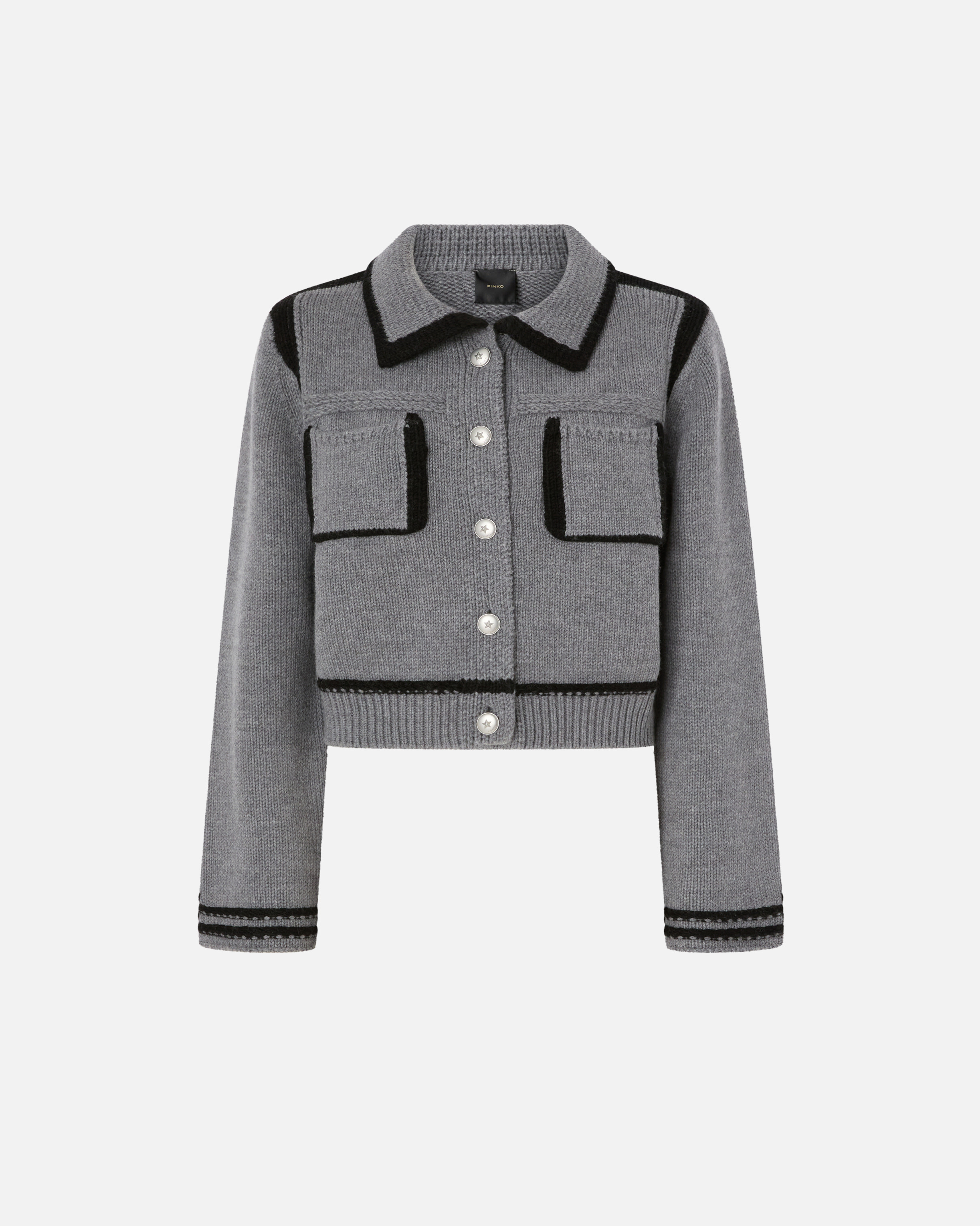SULCIS JACKET − 105498A2PLIZI Preppy-style cardigan in fine and soft merino wool. The design features a contrasting yarn that highlights the cuffs, yoke, hem, collar and front pockets. The final touch is given by the tone-on-tone label with PINKO lettering logo behind the neck. The piece has undergone finishing tests to minimise the possible formation of pilling, ensuring greater fabric softness and durability. Front fastening with star-decorated metal buttons. Practical, original and on-trend: this style is destined to become the real ace up your sleeve in your wardrobe. COMPOSITION Outer Yarn: WOOL 100%