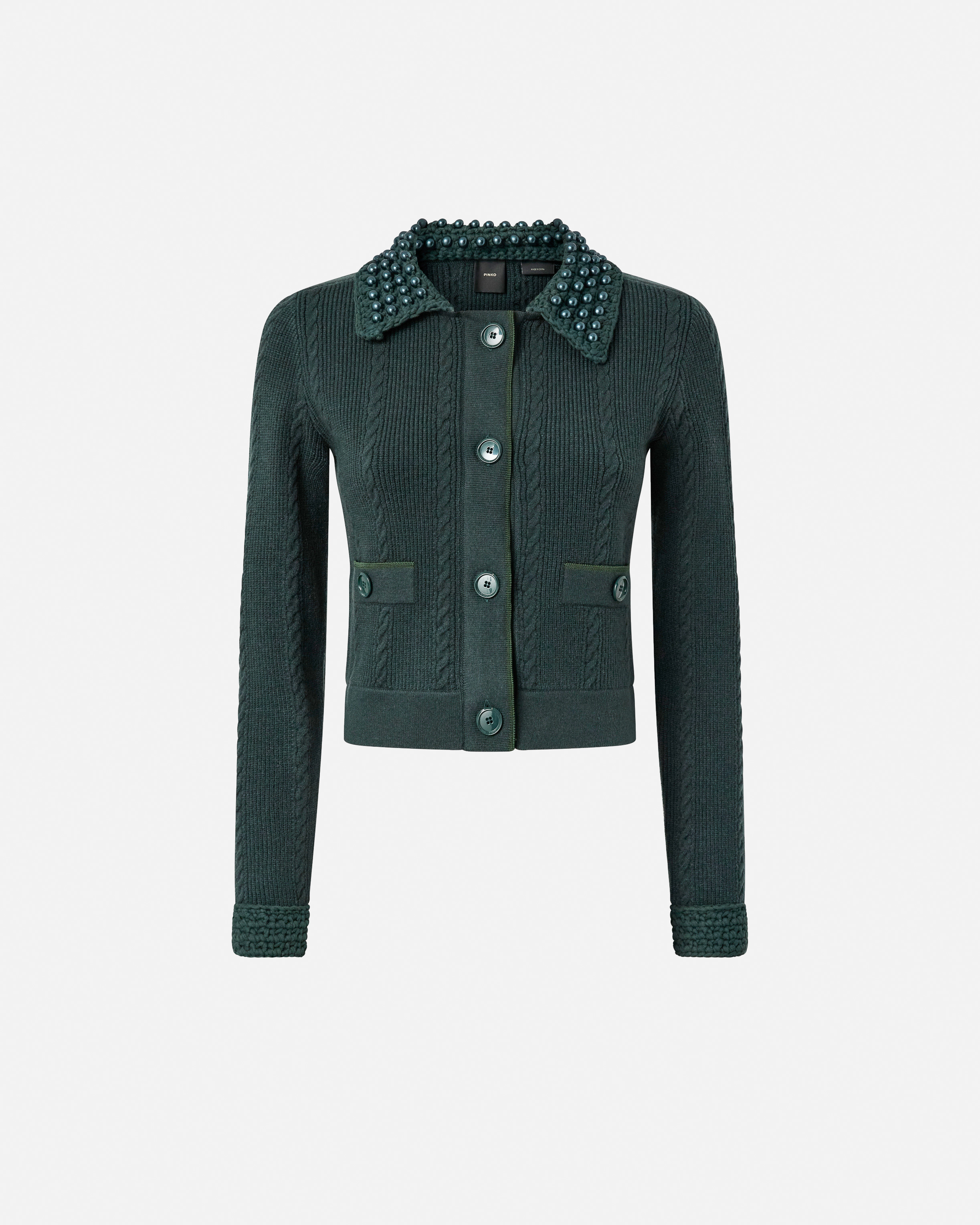 MOLISE JACKET − 105485A2QZX34 Slim-fitting short jacket in knit viscose-blend fabric. The design is animated by the alternating cable knit and rib knit, as well as being embellished by the pearl detailing in the same colour on the collar. The four buttons on the front are also found on the two side pockets. The final touch is given by the tone-on-tone label with PINKO lettering logo behind the neck. The piece has undergone finishing tests to minimise the possible formation of pilling, ensuring greater fabric softness and durability. The perfect choice for a comfortable look that does not compromise on elegance. COMPOSITION 1st Outer Yarn: ACRYLIC 62% POLYESTER 28% WOOL 10% - 2nd Outer Yarn: VISCOSE 100% - Neck: COTTON 100% - : ACRYLIC RESIN 100% ACRYL.RES. 100%