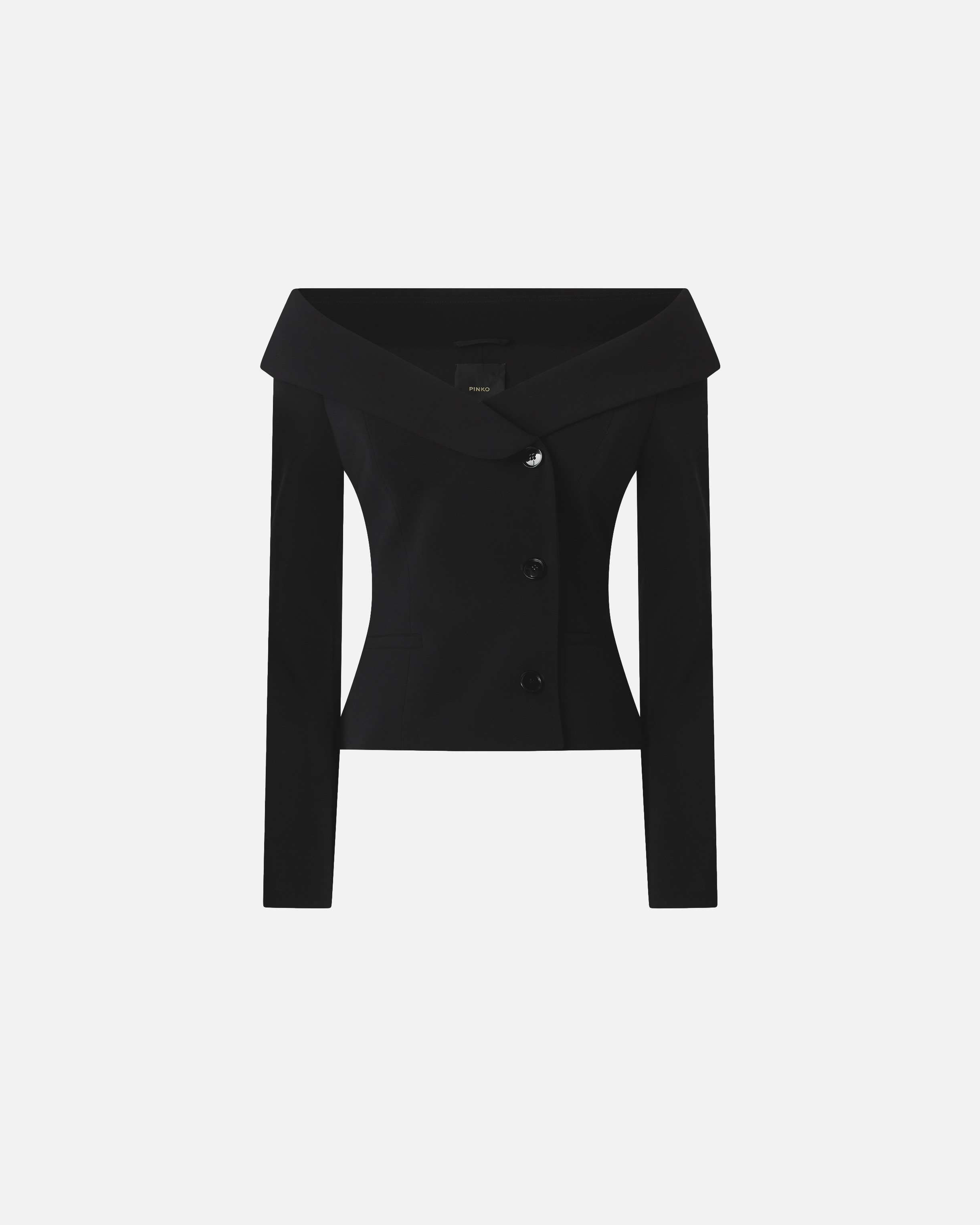 ANTONINA JACKET − 106132A304Z99 Slim-fitting, long-sleeved jacket in figure-flattering stretch crepe fabric. The off-centre button placket, buttoned cuffs and side welt pockets are a clear nod to the classic blazer's design, while the wide neckline that leaves the shoulders uncovered gives the item a decidedly feminine touch: the end result is structured yet classy in style, like only PINKO knows how. COMPOSITION Outside Fabric: POLYESTER 98% ELASTANE 2% - Lining: ACETATE 67% POLYESTER 33%