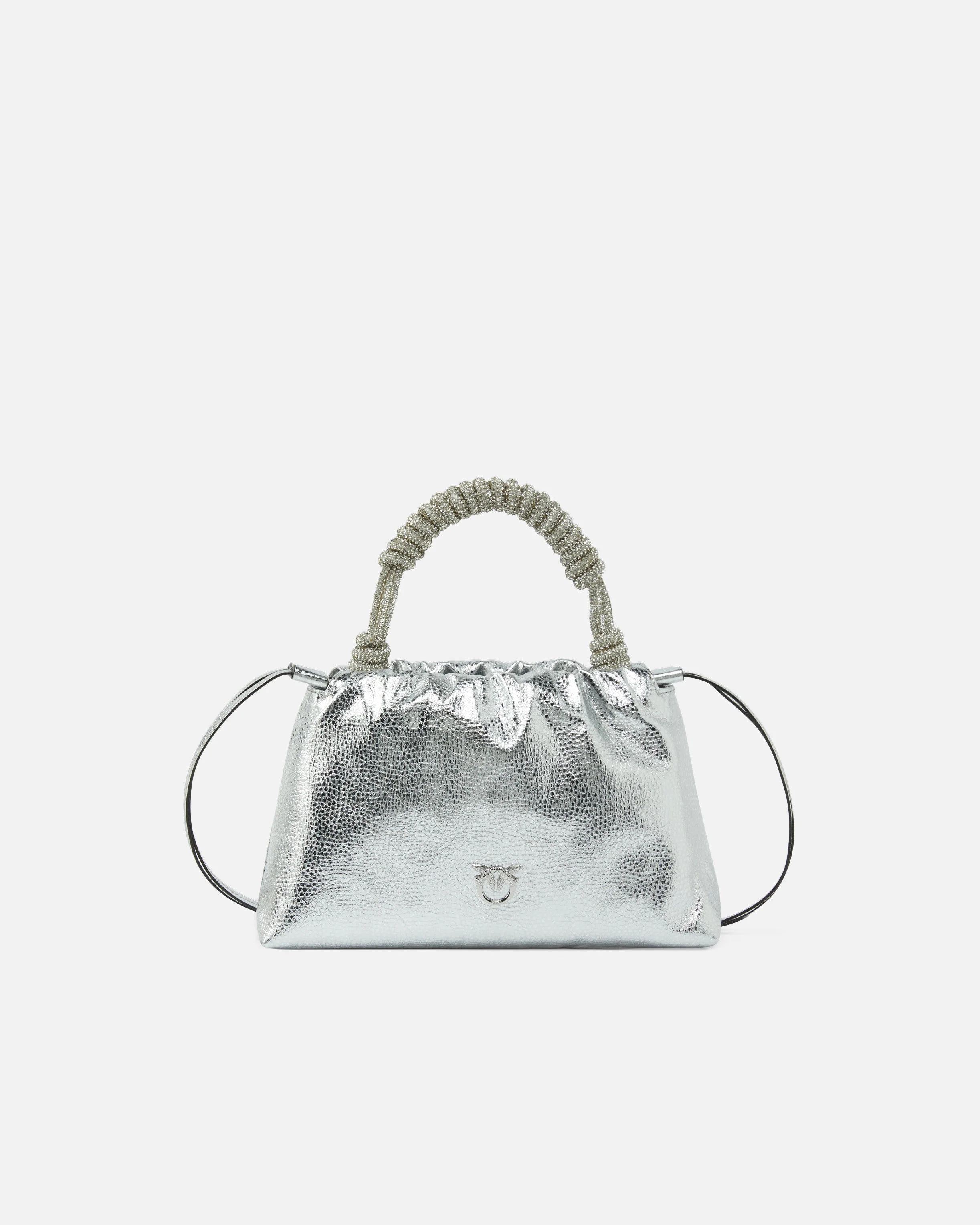 105908A2WD-ZZFN Small handbag with soft design and A-line shape, made from laminated and tumbled leather and fastened with a practical drawstring. Featuring an adjustable leather shoulder strap and a micro rhinestone-covered twisted handle so it can be carried by hand, on the shoulder, or crossbody, this bag is perfect for special occasions. The accessory features a cotton drill-lined interior and a zipped slip pocket. Activate your PINKO bag: verify the authenticity of your product and access a personalised experience by scanning the Love Birds embroidery on the back of the bag with your smartphone! COMPOSITION Leather: CALF LEATHER 100% CALFSKIN LEATHER 100% - Outside Fabric: Silica 100% SILICON DIOXIDE 100% - Internal: COTTON 100% - Accessory: Zinc 100% MEASURES W: 0.34 g H: 18.0 cm W: 7.0 cm L: 26.0 cm