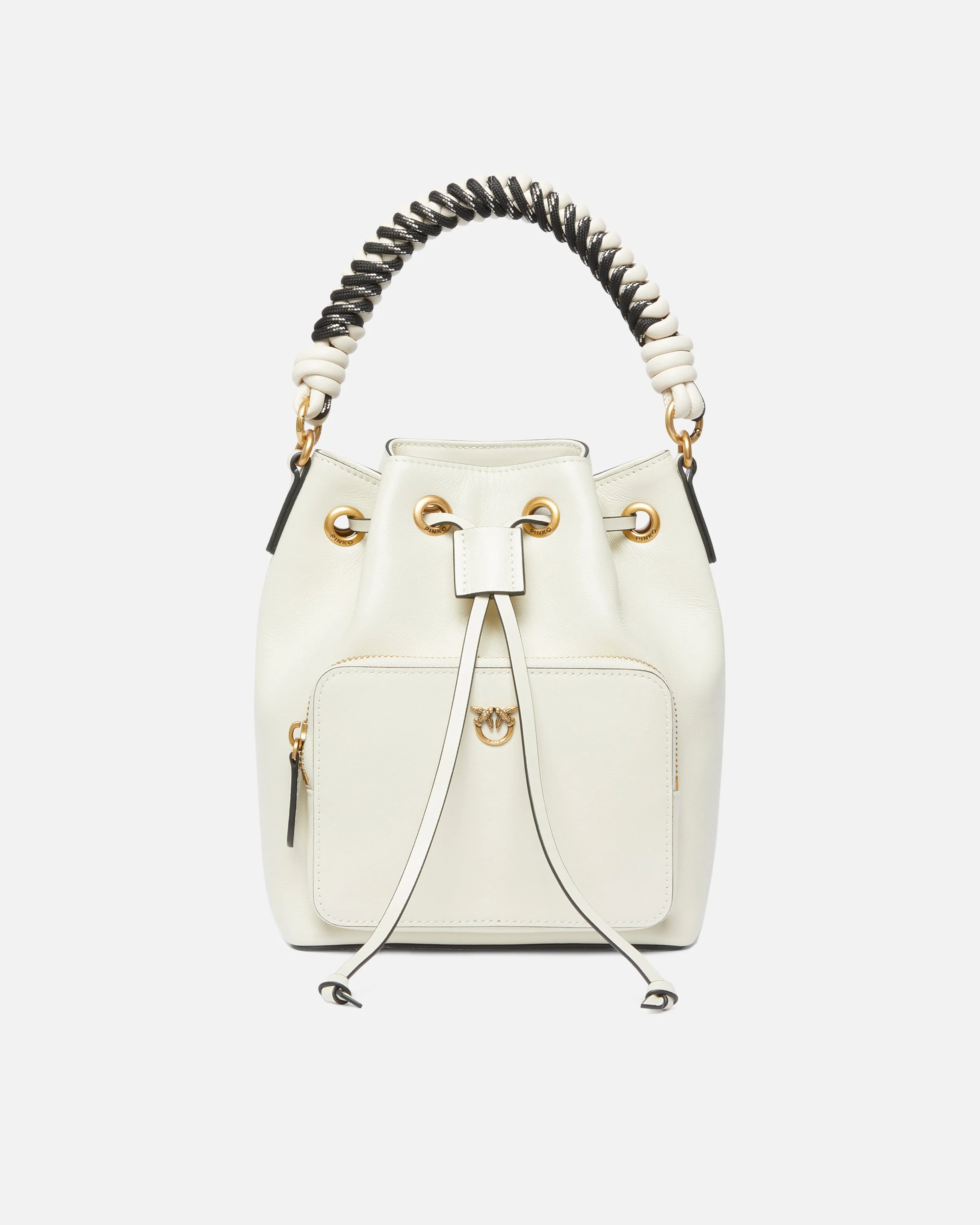 105112A2OV-Z14Q Small Cargo Bucket Bag in soft leather, complete with a cotton lining. Featuring a removable leather shoulder strap and braided handle so it can be carried by hand or crossbody, the bag is extremely versatile and practical. A distinctive accessory that is perfect for endless looks, this bag has a drawstring to adjust the fastening and an outer zip pocket to keep your essentials safe. The refined design is complemented by the Love Birds logo, which embodies the inimitable style of the brand. Activate your PINKO bag: verify the authenticity of your product and access a personalised experience by scanning the Love Birds embroidery on the back of the bag with your smartphone! COMPOSITION Leather: COWHIDE 100% BOVINE SKIN 100% - Outside Fabric: POLYURETHANE 100% - Lining: COTTON 100% MEASURES W: 0.62 g H: 22.0 cm W: 15.0 cm L: 19.0 cm