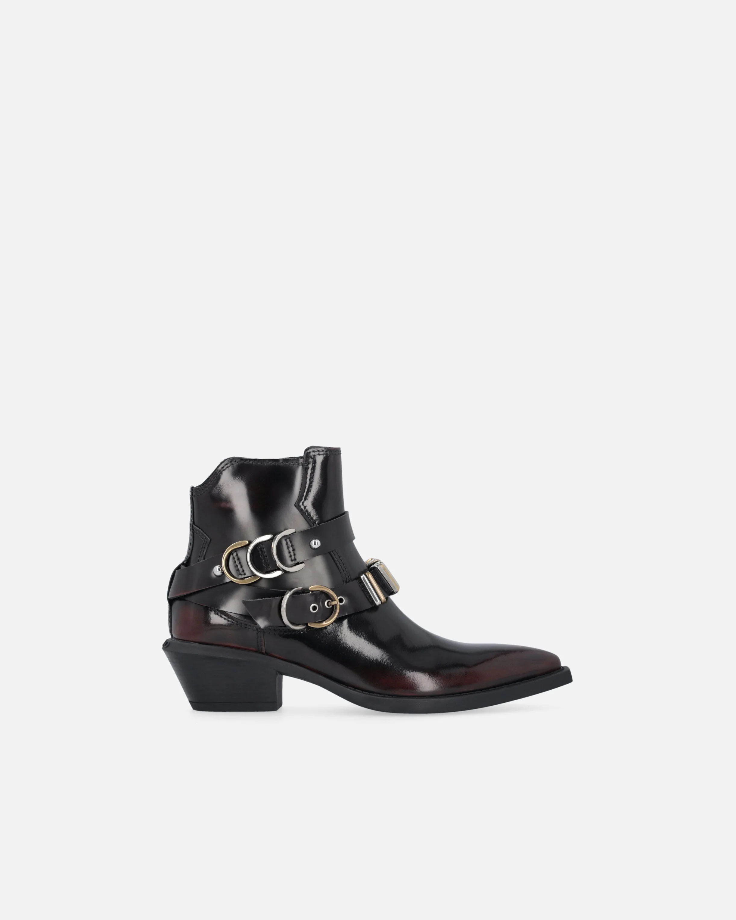 SD0343P114-P61 Cowboy ankle boots in fine smooth leather with wide, 5 cm-high heel. This model, equipped with two straps, combines geometric shapes and various plated finishes to perfection, with studs and loops of different sizes skilfully alternated to dynamic effect. The pure rubber sole provides excellent thermal insulation, ensuring maximum comfort and durability. We all know that details are what make the difference: choose this pair to give your casual looks a unique touch. COMPOSITION Lining: GOATSKIN 100% - : CALF LEATHER 100% CALFSKIN LEATHER 100% - Sole: GOATSKIN 100% - Sole: ELASTODIENE 100% RUBBER 100% MEASURES W: 1.55 g