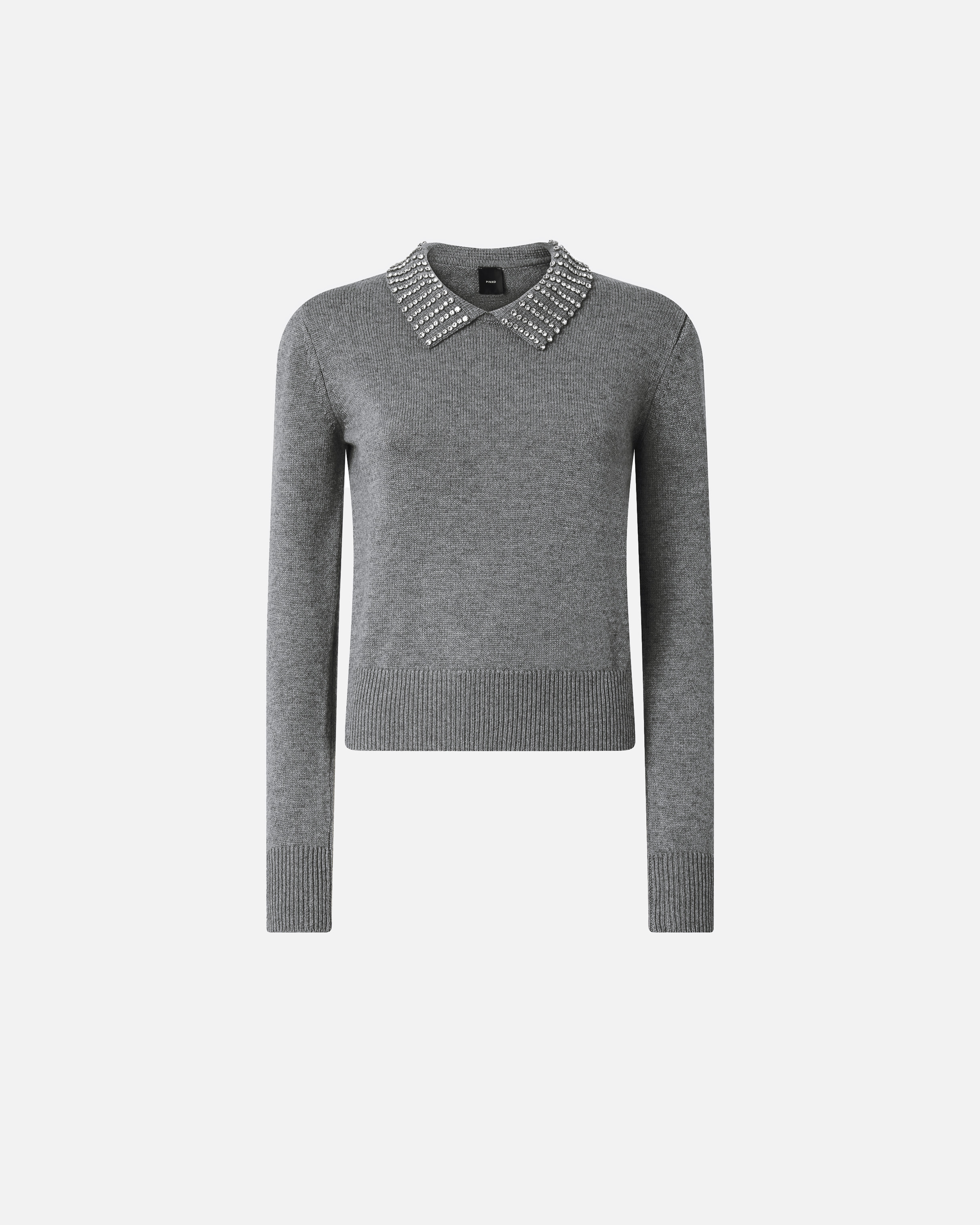 VENTOTENE KNITWEAR − 105530A2S4II2 Slim-fitting, long-sleeved sweater with polo-style collar. The collar immediately catches the eye thanks to the rhinestone appliques that embellish the design. The hem and cuffs are ribbed, while the tone-on-tone label with the PINKO lettering logo stands out on the lower front. The piece has undergone finishing tests to minimise the possible formation of pilling, ensuring greater fabric softness and durability. COMPOSITION Outer Yarn: POLYAMMIDE 48% POLYAMIDE 48% VISCOSE 27% WOOL 20% CASHMERE 5% - : Glass 100% - : STEEL 100%