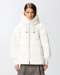 CRUSCA CAPE COAT − 105384A2PEZ05 Short, padded and slightly bell-shaped down jacket in technical canvas. The style stands out for its sportier look, provided by the matte finish of the fabric, and for its functional elements, such as the pockets with invisible zip, the rib knit on the high collar and cuffs, and the large adjustable hood with a trekking-inspired drawstring equipped with a peak to protect you from the rain. The patch with rubber-effect Love Birds logo on the front left side customises this piece of outerwear in pure PINKO style. Two-way metal zip fastening on the front. Lined model. COMPOSITION 1° Outside Fabric: POLYESTER 100% - 2° Outside Fabric: POLYESTER 98% ELASTANE 2% - Body lining: POLYESTER 100% - Sleeve lining: POLYESTER 100% - Padding: POLYESTER 100%