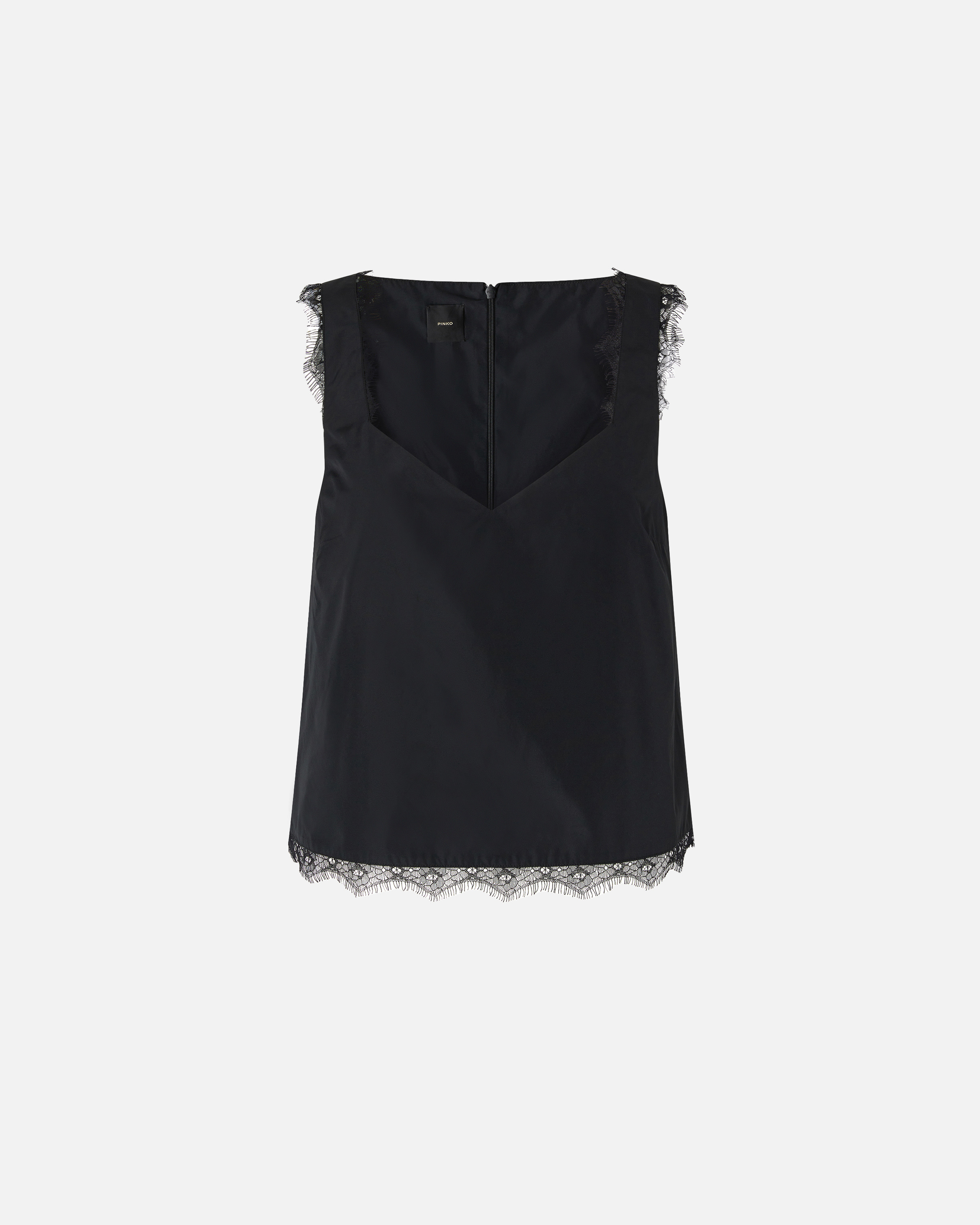 FLORINA TOP − 106105A30BZ99 Sleeveless top with geometric V-neck, made from memory microfibre taffeta. The crinkled look of the fabric works perfectly with the inlaid lace edging the hem and armholes. Pair this lingerie-inspired top with the matching skirt for a sensual evening look, or wear it with a pair of tailored trousers for an outfit that won't go unnoticed. COMPOSITION Outside Fabric: POLYESTER 100% - Accessory: POLYAMMIDE 100% POLYAMIDE 100% - Lining: POLYESTER 100%