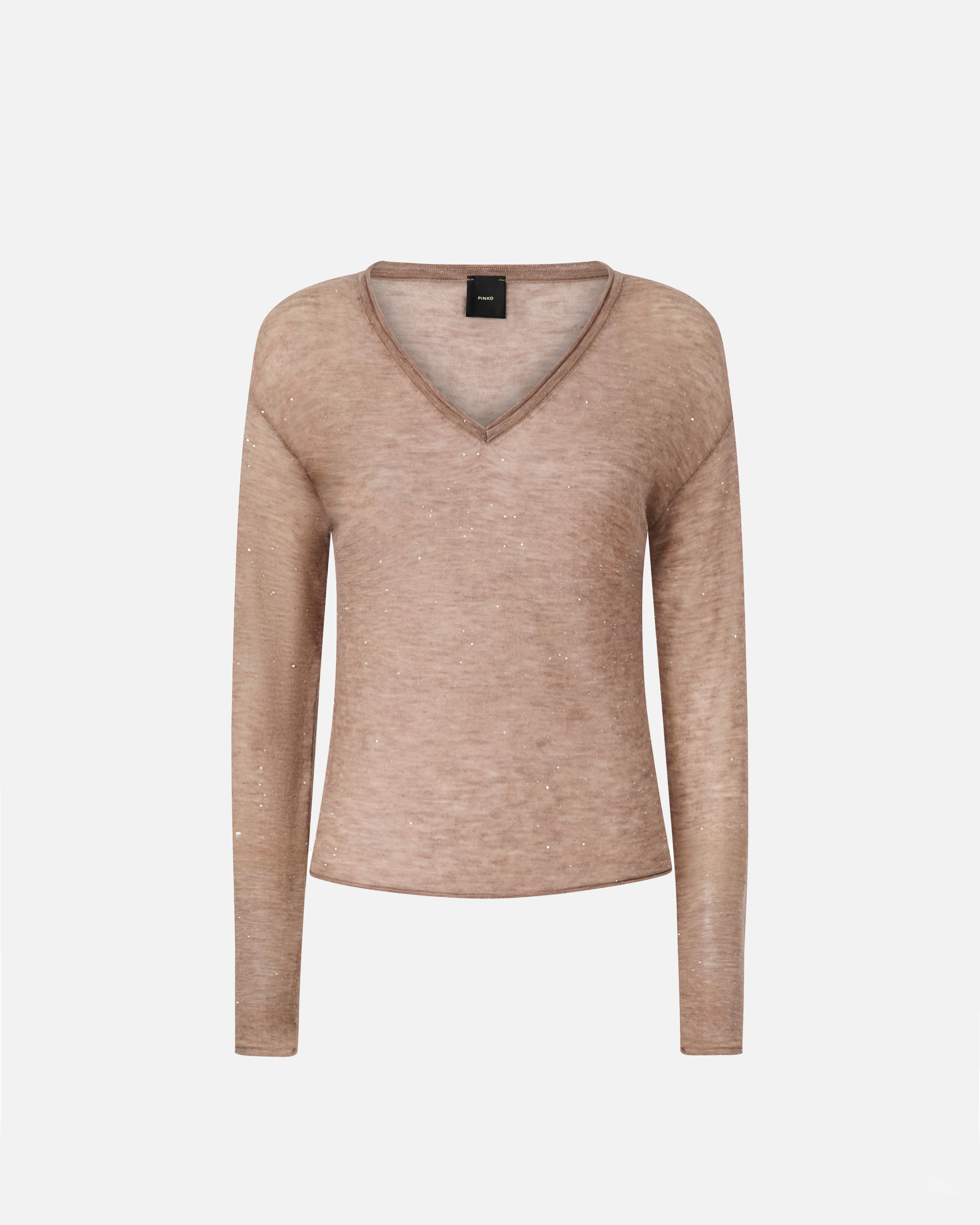 SALOMONE KNITWEAR − 105400A2PMD23 V-neck sweater made from a semi-sheer wool blend: a lightweight and soft yarn that is almost impalpable, which helps create a sensual and striking look. The design is embellished with micro-sequins inserted in the thread and manages to be shiny and understated and extremely comfortable to wear, all at the same time. The piece has undergone finishing tests to minimise the possible formation of pilling, ensuring greater fabric softness and durability. The final touch is given by the label with PINKO lettering logo on the back. COMPOSITION Outer Yarn: WOOL 98% POLYESTER 2%