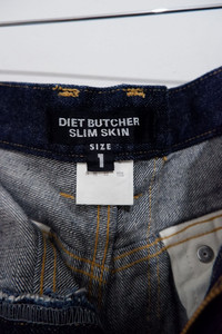 Please note the details before buying Diet Butcher Slim Skin Front Back Selvedge Denim Size on tag 1 Made in japan condition : Good Condition Flaws : Nothing ---------------------------------------------- Contact us for more questions DELIVERY: Using DHL EXPRESS Please leave your phone number during purchases, Phone number Required for delivered prosses REFUNDS: No returns, exchanges or refunds THANKS