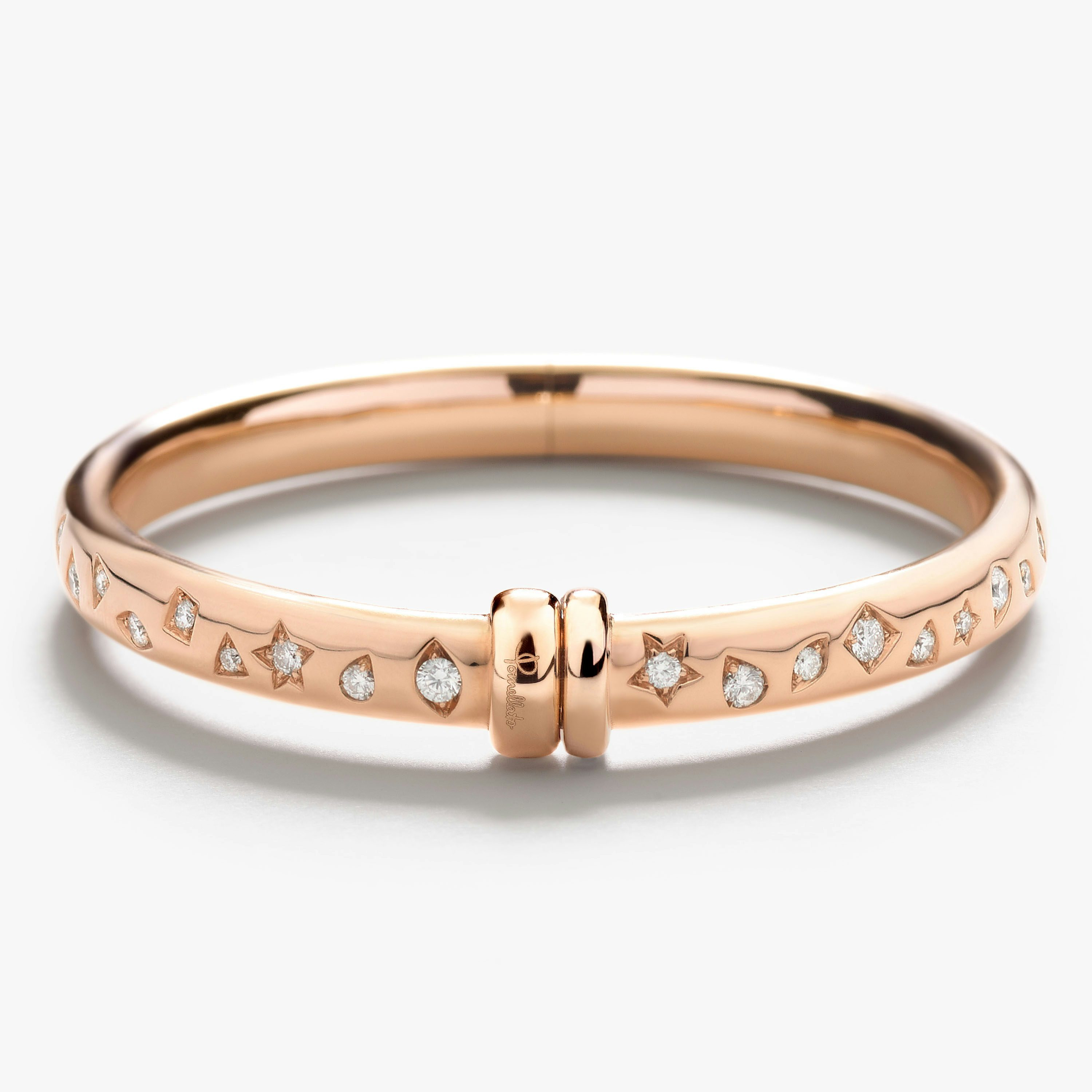 SKU: PBC1000_O7000_DB000 Bracelet In 18K Rose Gold With 40 White Diamonds (≈1.4 Cts). Iconica, Pomellato’s collection of sinuous gold jewels, was crafted as an homage to the Maison’s rich goldsmith tradition. Each artisanal Iconica creation is a masterpiece of jewelry art for the jewelry aficionado. For the premier fancy setting parure, a new easy-close Iconica bangle is sculpted of rose gold and hand-carved diamond settings in the shapes of Pomellato stars, triangles, droplets, diamonds and squares.