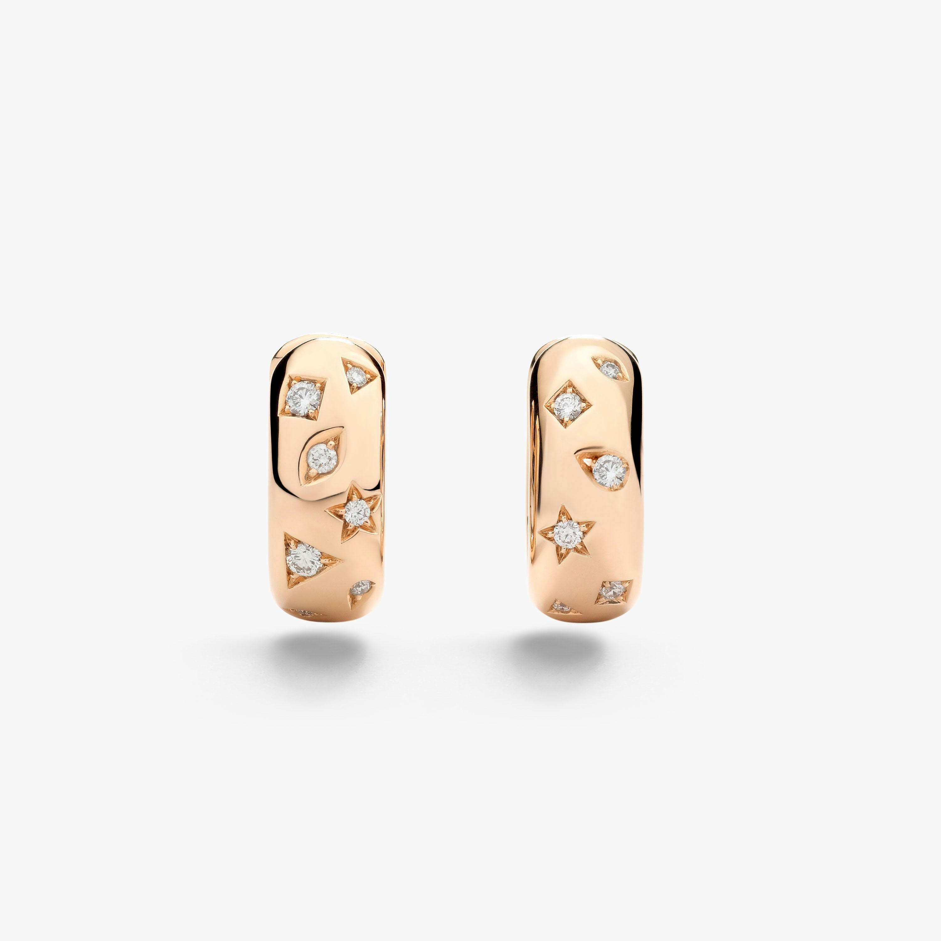 SKU: POC2061_O7000_DB000 Earrings In 18K Rose Gold With 13 White Diamonds (≈0.4 Ct). An artisanal legacy constructed in the past, safeguarded in the present, and projected into the future comes through in the Iconica collection. Designed to honors Milan’s rich heritage of jewellery making and the goldsmith tradition of Pomellato, The Iconica jewels are an elegant balance of refined design, superb craftsmanship, and luxurious materials. A tribute to Pomellato’s unique design, these Iconica earrings in rose gold are skilfully set with white diamonds in the shapes of princess, marquise, triangle, star, and drop.The essence of effortless Milan chic.