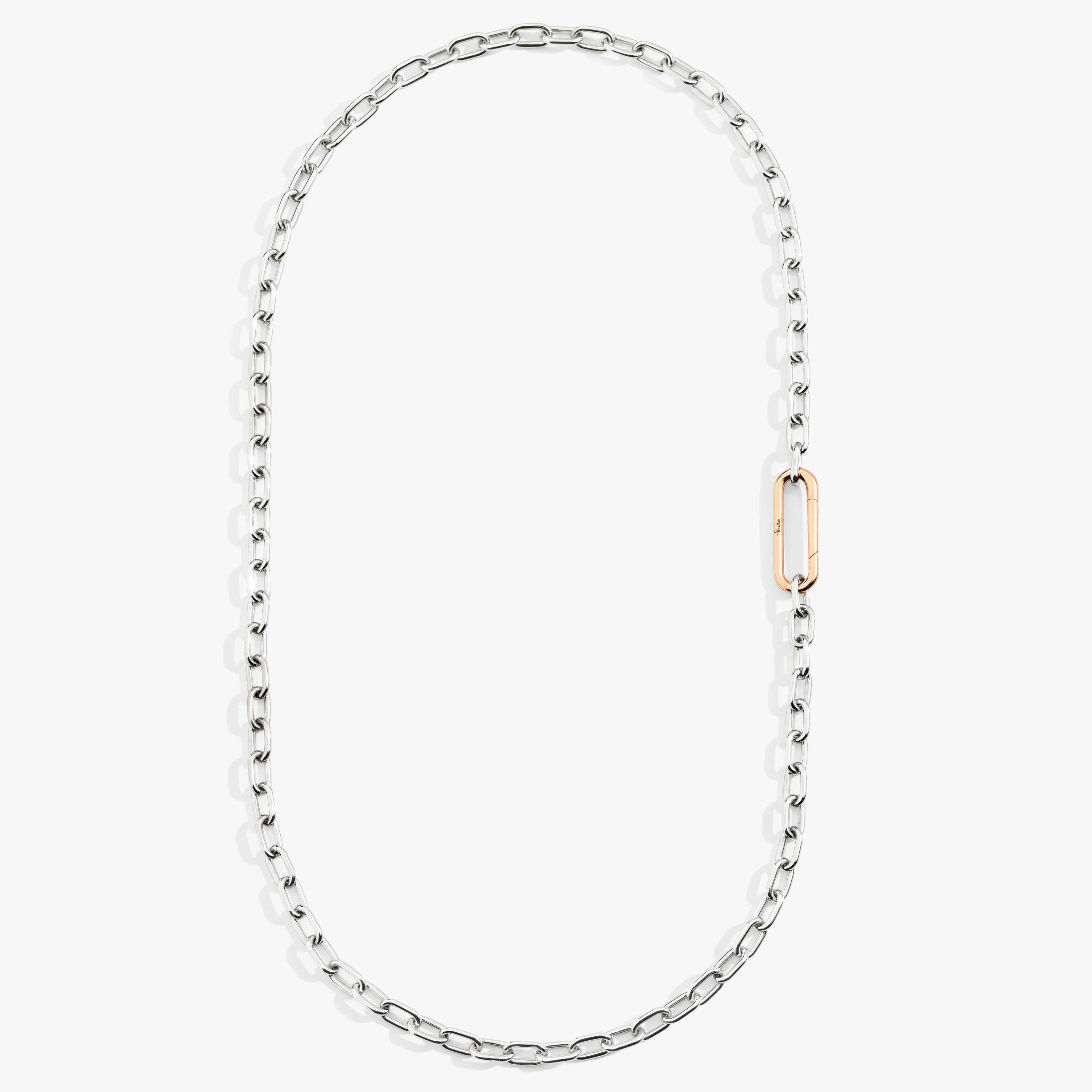 SKU: PCC3040_O6WHR_00000 Necklace In 18K Rhodium-Plated White Gold And Rose Gold. The chain necklace in white gold and rose gold features the distinctive outsize link snap-closure of Iconica, the simple lines are gender-fluid and their universal appeal is instantly evident. Essential and refined, inspired by Milanese design.
