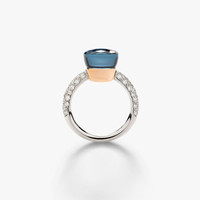 SKU: PAC0040_O6WHR_B0TTU Ring In 18K Rhodium-Plated White And Rose Gold With 1 London Blue Topaz, 1 Turquoise (≈10 Cts) And 58 White Diamonds (≈0.7 Ct). Pomellato splashes the Nudo Deep Blue range of jewels with a beautiful new hue and precious diamonds. The joy of color characterizes each Nudo jewel, and the new sea-blue stone dives into the reflections of Mediterranean waters.