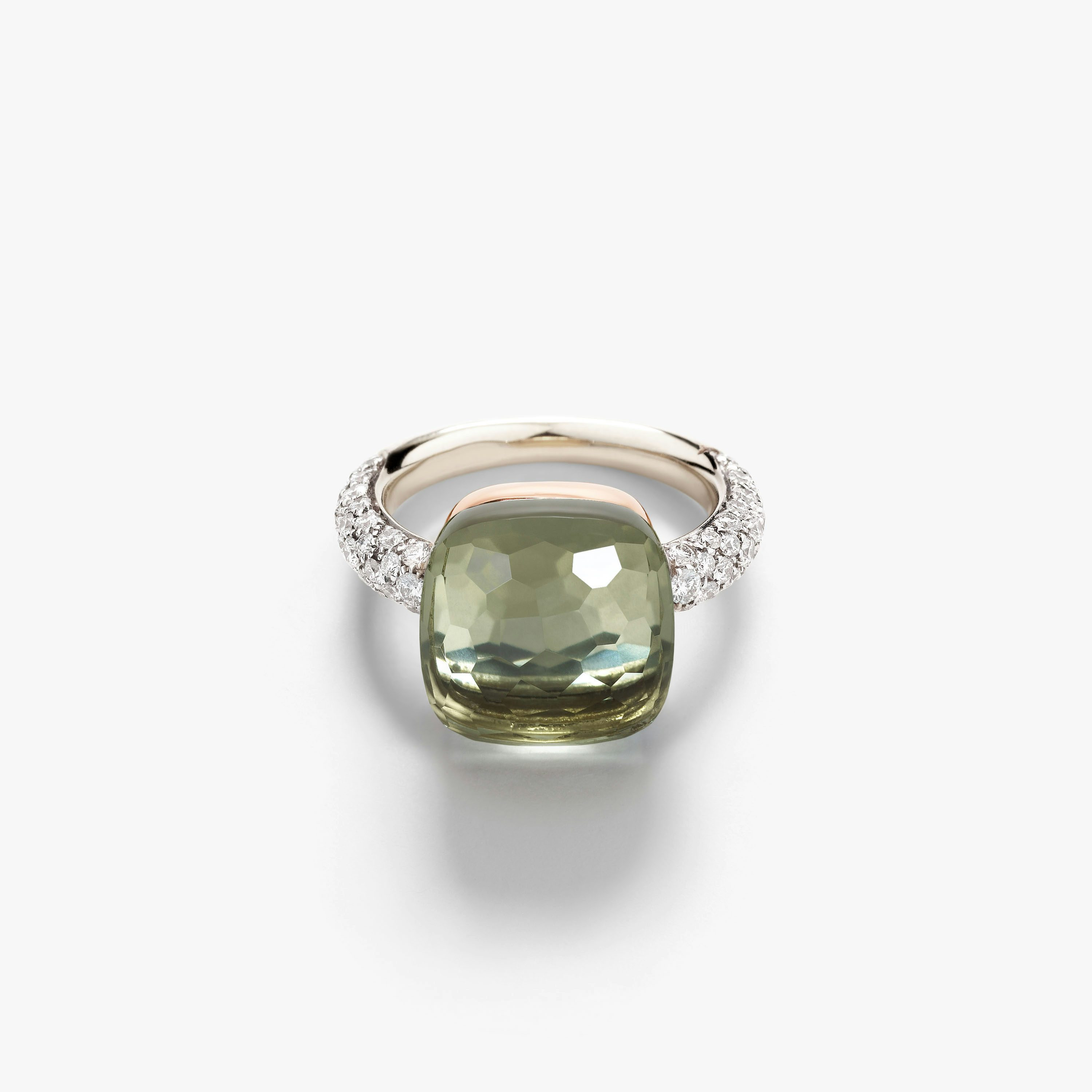 SKU: PAB4010_O6000_DB0PA Ring In 18K White And Rose Gold With 1 Prasiolite (≈10.9 Cts) And 58 White Diamonds (≈0.7 Ct) On 18K White Rhodium-Plated White Gold. A precious version of the brand's most iconic ring, this Nudo features a diamond-dusted ring band. Characterized by a 'nude' stone with a copyrighted design, the audacity and color choices of Nudo make it a striking original.