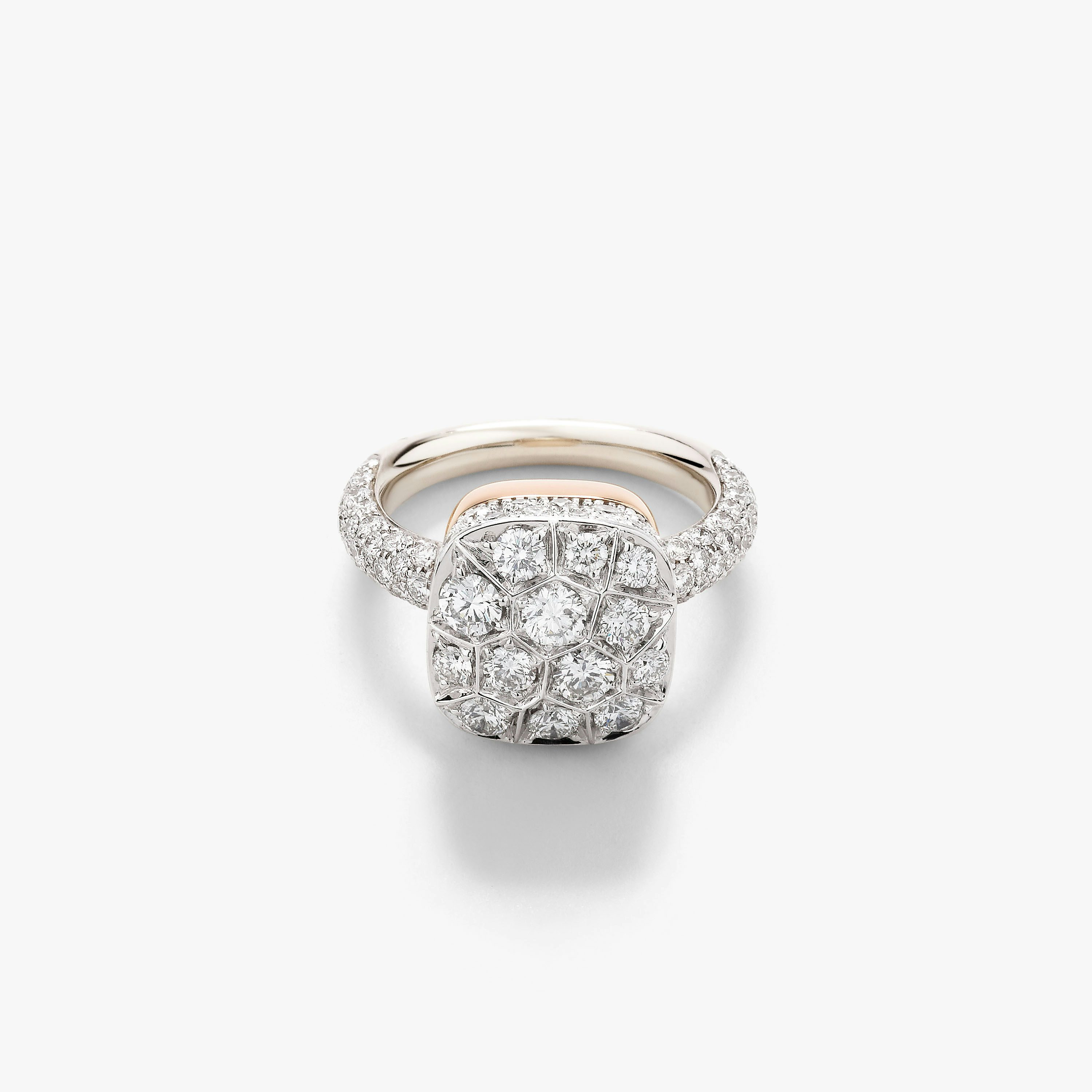 SKU: PAB7041_O6000_DB000 Ring In 18K White And Rose Gold With 106 White Diamonds (≈2.2 Cts) On 18K White Rhodium-Plated White Gold. Nudo is quintessentially Pomellato and an iconic design of the house. With the revolutionary idea to free the gem from the bezel and present the naked splendor of the gem, every facet of Nudo’s gemstones evoke Pomellato’s playful spirit and Milanese colorful and understated elegance. The Nudo Solitaire is the house’s interpretation of a diamond ring that goes beyond a traditional engagement ring. The generous proportions of the ring highlight the bold and unconventional set of the white diamonds, an homage to the irregular facets of the original Nudo collection.