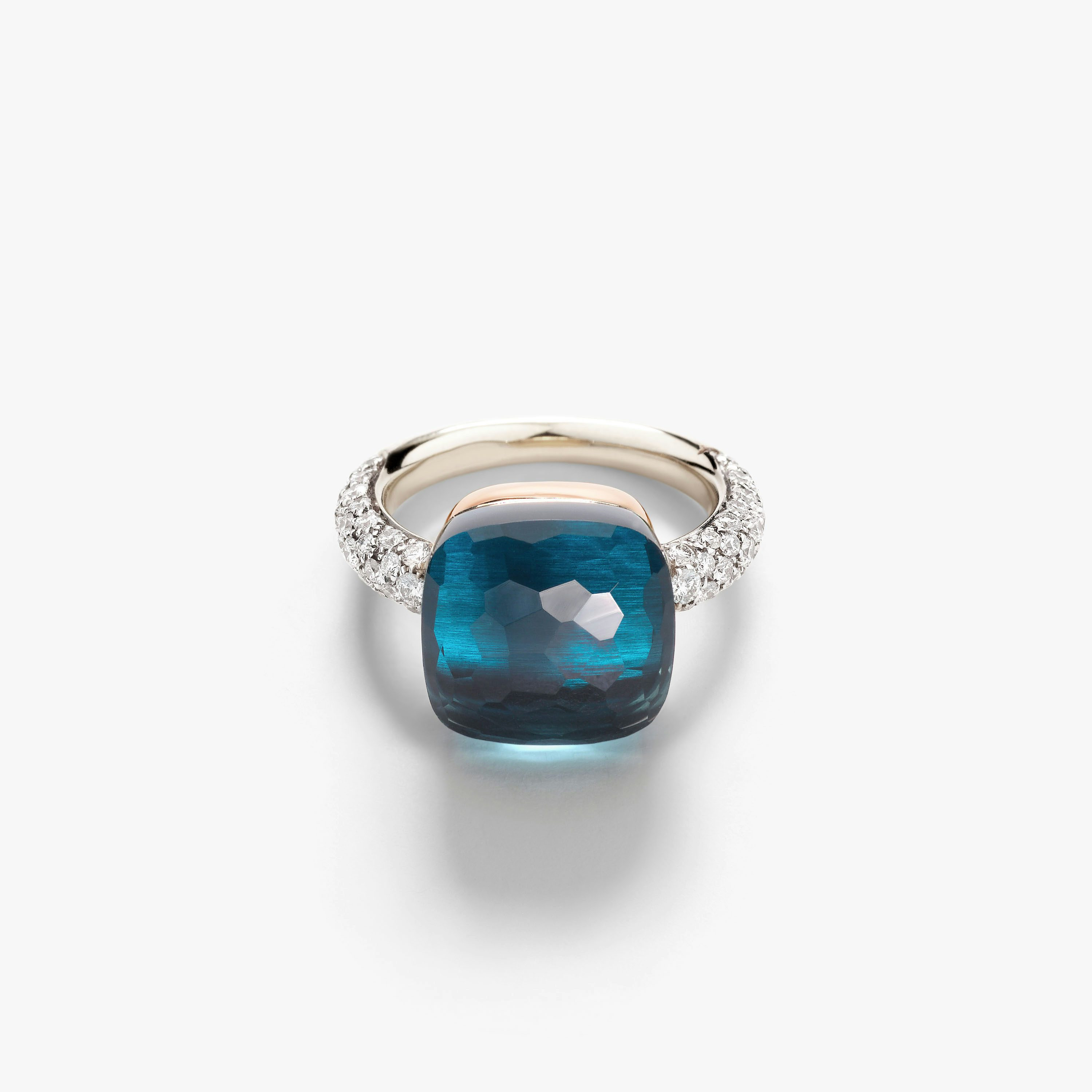SKU: PAB4010_O6000_DB0TL Ring In 18K White And Rose Gold With 1 London Blue Topaz (≈15 Cts) And 58 White Diamonds (≈0.7 Ct) On 18K White Rhodium-Plated White Gold. Nudo is quintessentially Pomellato and an iconic design of the house. With the revolutionary idea to free the gem from the bezel and present the naked splendor of the gem, every facet of Nudo’s gemstones evoke Pomellato’s playful spirit and Milanese colorful and understated elegance. Precious version of the brand's most iconic ring, this Nudo jewel features a vibrant London blue topaz in Maxi size with a sparkling white diamond pave.