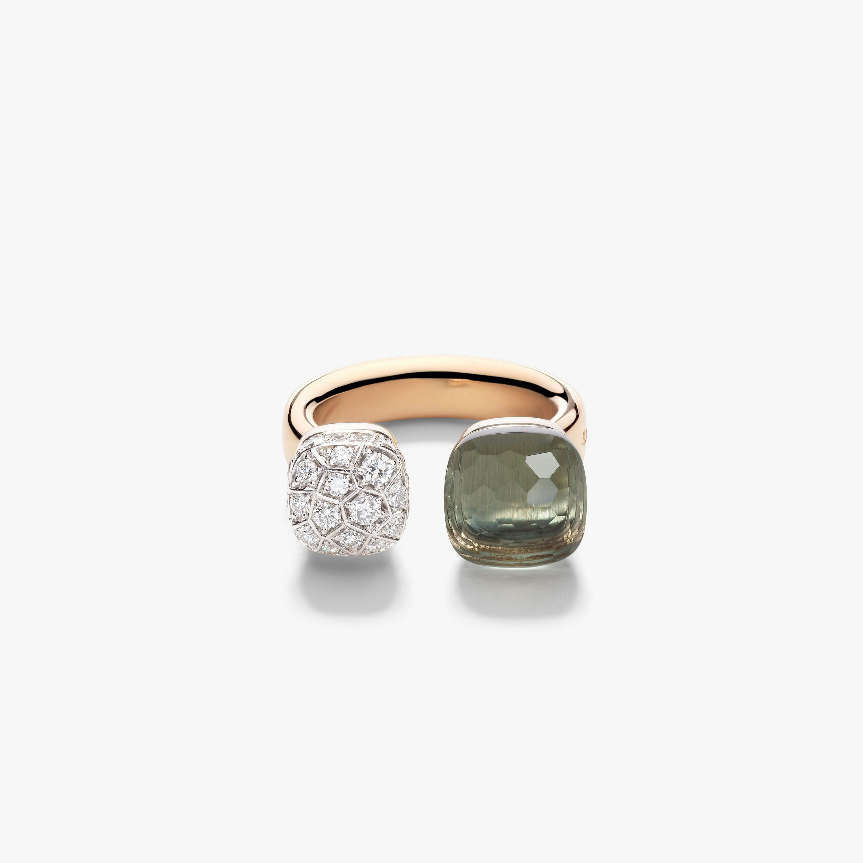 SKU: PAC4020_O6WHR_DB0PA Ring In 18K Rose And White Gold With 1 Prasiolite (≈7 Cts) And 39 White Diamonds (0.8 Ct) On 18K Rhodium-Plated White Gold. Nudo is quintessentially Pomellato and its bold silhouette has become the most iconic design of the house. With the revolutionary idea to free the gem from the bezel and present its naked splendor, every facet of Nudo’s gemstones evoke Pomellato’s unique spirit and the understated elegance of Milan. The new Nudo toi et moi rings are a symbol of the union between nature and the art of Pomellato crasftsmanship. Combining a mossy-green prasiolite in Classic size with the silhouette of the Nudo Petit covered in a diamond pave. The toi et moi rings are bold enough to wear individually or easily composed into a colorful stack to create a graphic mosaic of color and diamonds.
