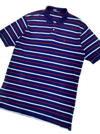POLO by RALPH LAUREN BLUE STRIPES POLO SHIRT HAVE ANOTHER PRICE IN YOUR MIND? WE WELCOME OFFERS. DO OFFER YOUR PRICE. ITEM DESCRIPTION : • TAG LABEL : POLO by RALPH LAUREN • MADE IN : MALAYSIA • OVERALL; THE ITEM IS STILL IN GOOD CONDITION (8/10) ;- PLEASE REFER PHOTO • NO MAJOR STAINS, RIPS OR HOLES FOUND.- PLEASE REFER PHOTO. • SIZE : XL (By measurement) • MATERIAL: 100% COTTON MEASUREMENT: • ARMPIT TO ARMPIT : 24 INCH (CHEST 48) • LENGTH FROM SHOULDER TO HEM : 35 INCH ATTENTION : Please pay close attention to the measurements provided. Do not rely on tag size as pre-worn/owned items may have been altered, stretched or shrunk & vintage sizes do not correlate with modern sizing. The best way to ensure a correct fit is to compare your measurements with the measurements of item that fits you well. Please enlarge the photos for clearer image. ALL MEASUREMENTS ARE TAKEN WITH THE GARMENT LYING FLAT ON THE GROUND WORLDWIDE SHIPPING COST : 1) DHL EXPRESS : $40 (ETA 3-5 DAYS TO ARRIVE) (PLEASE REQUEST IF THE ITEM NEEDED TO BE EXPEDITED - ADDITIONAL COST REQUIRED;, UNLESS, WE USED REGISTERED MAIL SERVICE ) 2) REGISTERED MAIL INTERNATIONAL SERVICE : $20 (ETA 14-21 DAYS TO ARRIVE) BOTH TRACKING NUMBER INCLUDED. PAYMENT BY PAYPAL ONLY. NOTE : PLEASE DROP OFF YOUR PHONE NUMBER ON THE NOTE WHEN MAKE A PURCHASE, WE WOULD LIKE TO PUT ON POST SERVICES. PLEASE LEAVE MESSAGE IF THERE'S ANY INQUIRY. I WILL GLADLY TO REPLY YOU. HAPPY SHOPPING. DISCLAIMER : This is NOT a brand new item UNLESS stated so. This is a PRE-OWNED item and VINTAGE ; which some of the garment should show some signs of wear . Even so, every item showcased at Thrift.inc is in IMMACULATE quality, and those signs of wear will NOT affect the wearer in any way. NO RETURN; hence, please read the description carefully before purchasing.