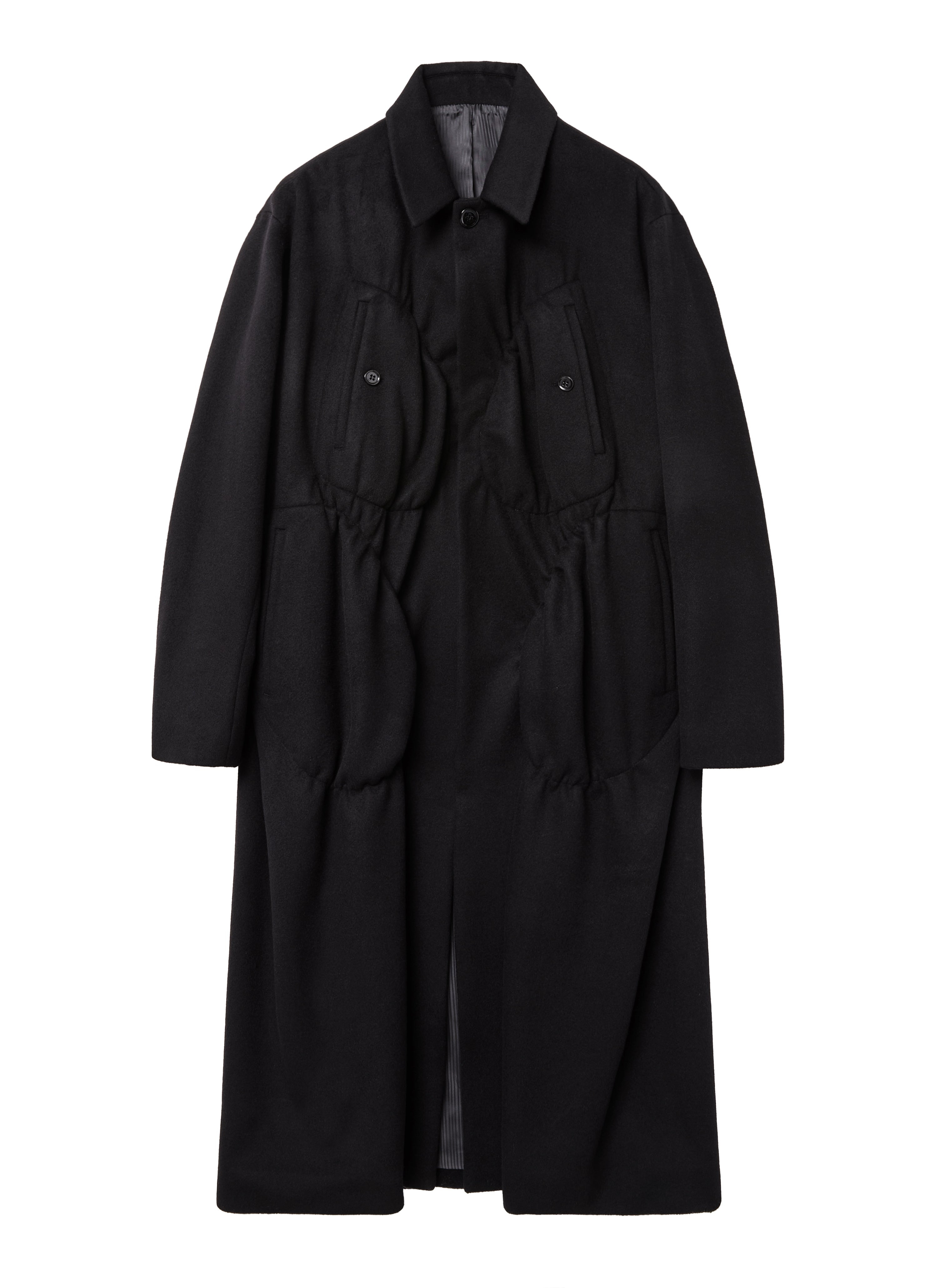 Straight point collar Two button closure chest pockets Two hand pockets on waist Shirred construction along pockets One interior pocket Oversized fit Details Logo engraved button Composition Fabric 1 : Wool 70%, Polyester 15%, Cashmere 10%, Nylon 2%, Acrylic 1%, Rayon 1%, Cotton 1% Lining : Rayon 100% Size Guide Size(Length/Chest/Arm/Shoulder) XS : 124cm/54cm/47.5cm/61cm S : 127cm/57cm/49.5cm/63cm M : 130cm/60cm/51.5cm/65cm L : 133cm/63cm/53.5cm/67cm XL : 136cm/66cm/55.5cm/69cm