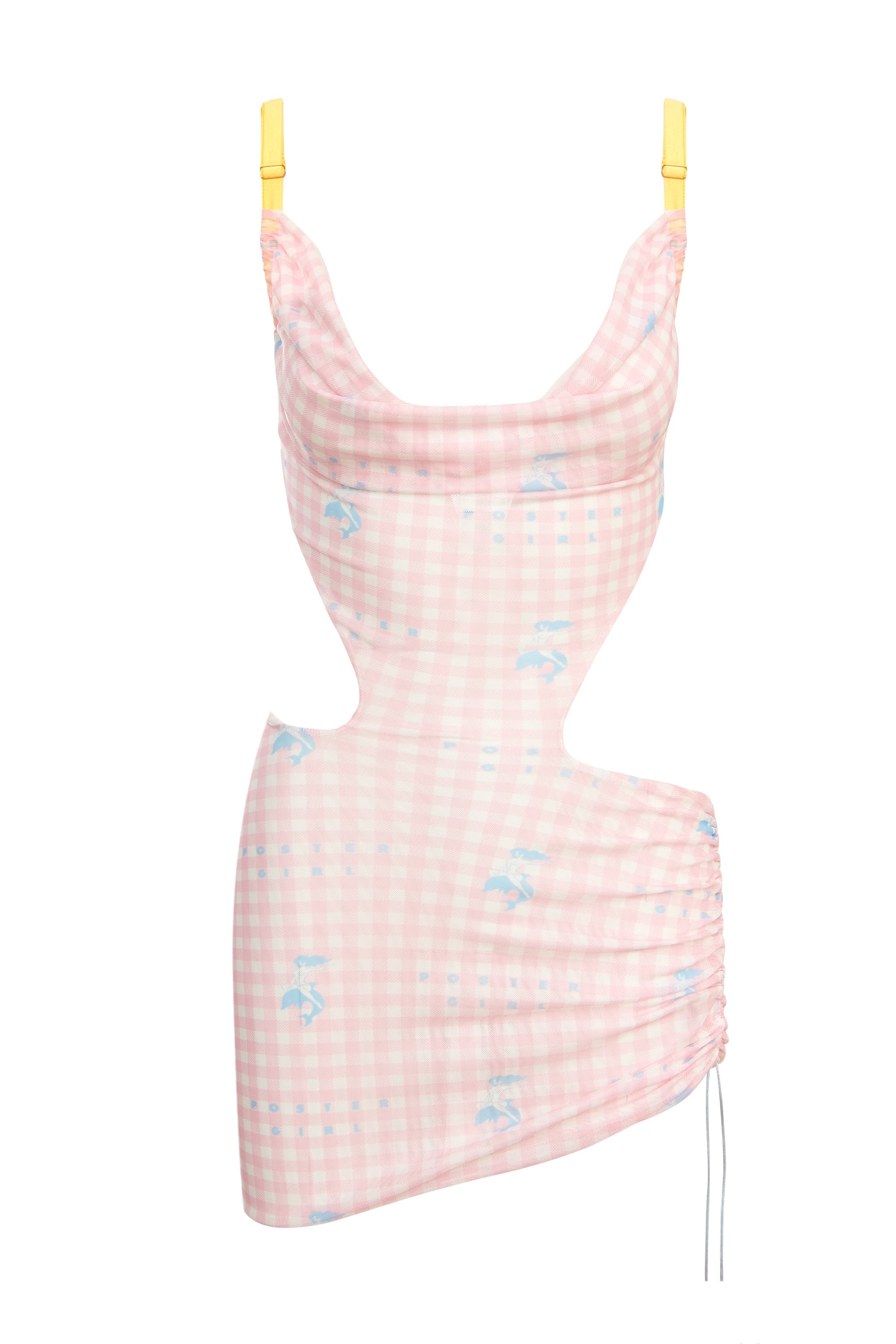 Dive into the exclusive POSTER GIRL POOLSIDE collection with the Amber Dress in Pink Gingham. The mini dress is crafted in our signature super soft power mesh and debuts our iconic POOLSIDE gingham logo print. Featuring a unique high leg, skin baring cut out and flattering cowl neck, the Amber Dress the perfect poolside look. With adjustable bra straps for maximum comfort and diagonal gathered skirt finishes the design with an asymmetric detail. - 95% Elastane 5% Polyamide - Model Height: 5'9"/ 175cm and wears size S