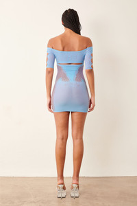 Indulge in luxury and sophistication with the Archer Dress in Crypto Blue. This stunning off the shoulder bodycon dress features heart buttons on the sleeve and a delicate peephole detail. The blue color adds a touch of elegance, while the arrow motif adds a unique and artistic touch. Elevate any occasion with this exclusive dress. - Designed in London, Made in Italy - Sculpting hosiery shapewear - Eagle feather motive - Crystal Heart Buttons - Model is 5"11/180cm