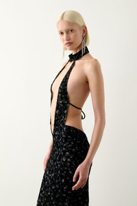 Looking for a sexy and sophisticated party piece? Meet the Bare Dress. This halterneck maxi dress has been cut from a flocked leopard print complete with Kama Sutra positions, and features a low plunging neckline & open back with tie fastening that can be adjusted for the perfect fit. Designed with a back vent slit in the skirt of the dress for a sexy and sleek finish. - Sex tape pattern - Backless but with back tie to adjust fit - Bra fastening at neck - Back vent slit - Model wears size s - Model Height: 5'10/178cm